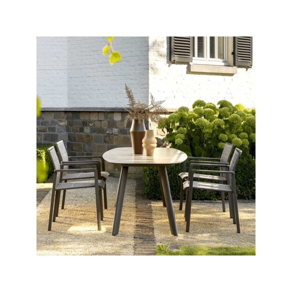 De 4 Seasons Manolo Tuintafel met geprint keramisch blad Terre 180x95cm combineert stijl, comfort en duurzaamheid. Ideaal voor gezellige momenten buiten, ongeacht het seizoen.