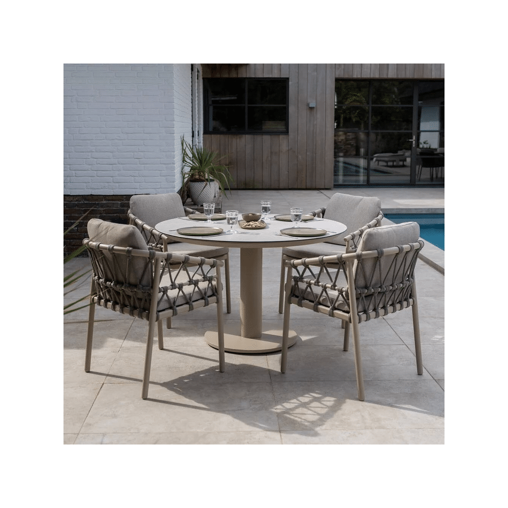 De 4 Seasons Sarah Tuintafel 120cm Latte combineert stijl, comfort en duurzaamheid. Een ideale keuze voor compacte buitenruimtes en gezellige momenten in de tuin.