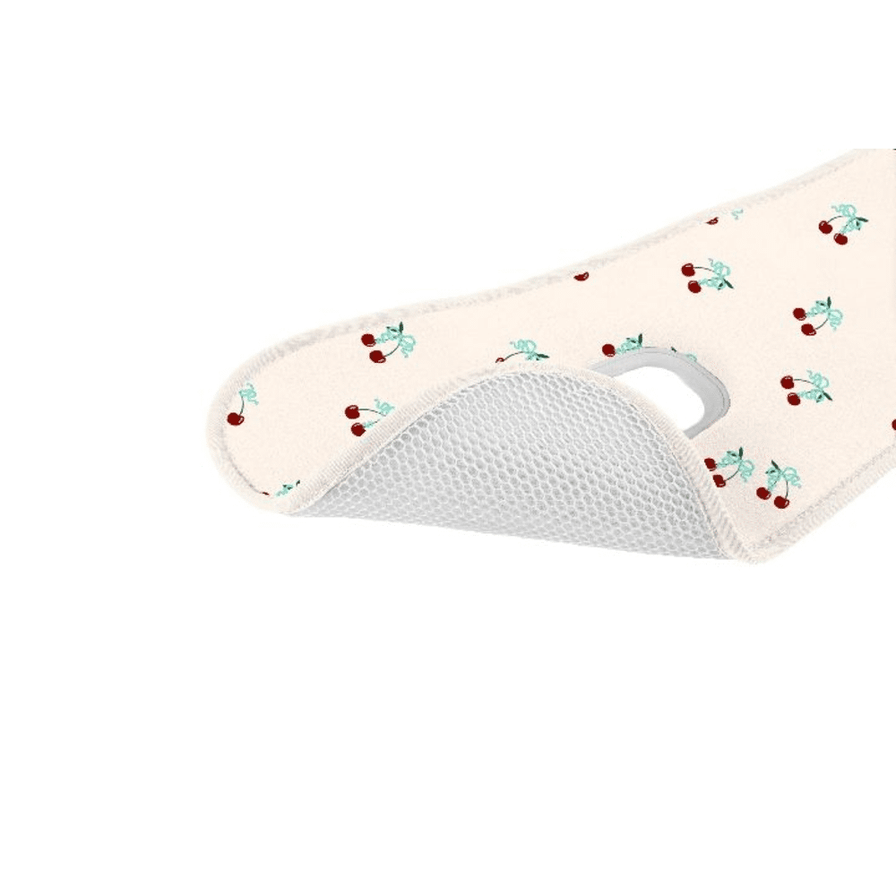 Het ergonomische ontwerp ondersteunt nek en rug, terwijl het zachte materiaal de huid beschermt. De inleg is eenvoudig te installeren en uitwasbaar. Het vrolijke Cherries design maakt elke rit extra speels en kleurrijk.