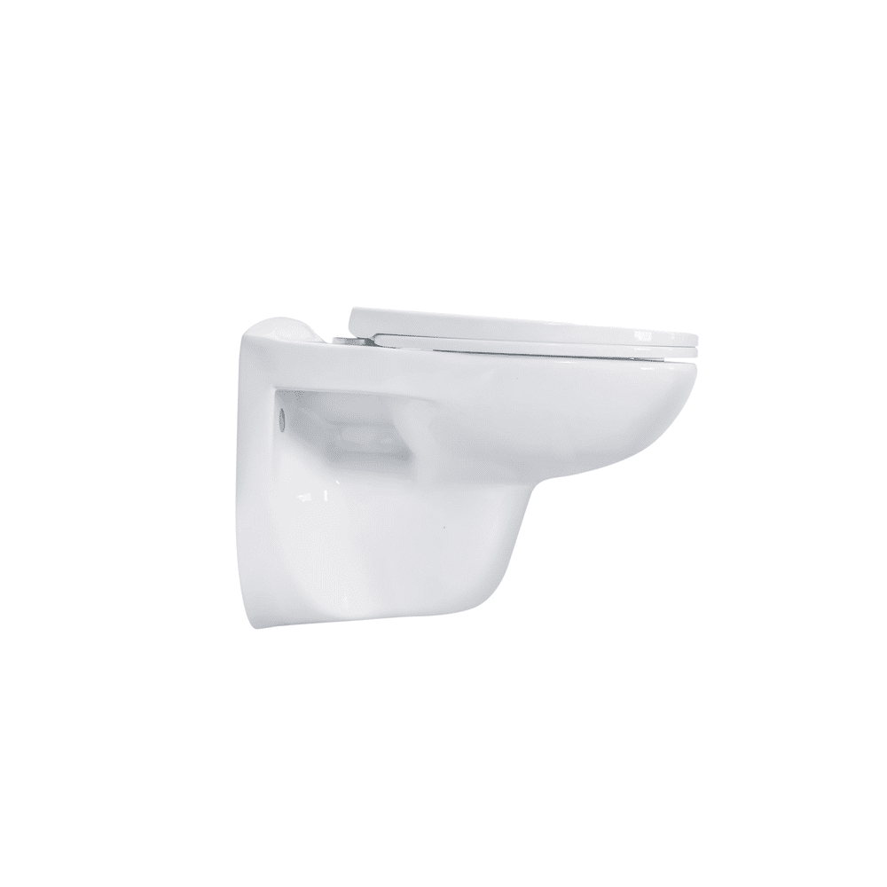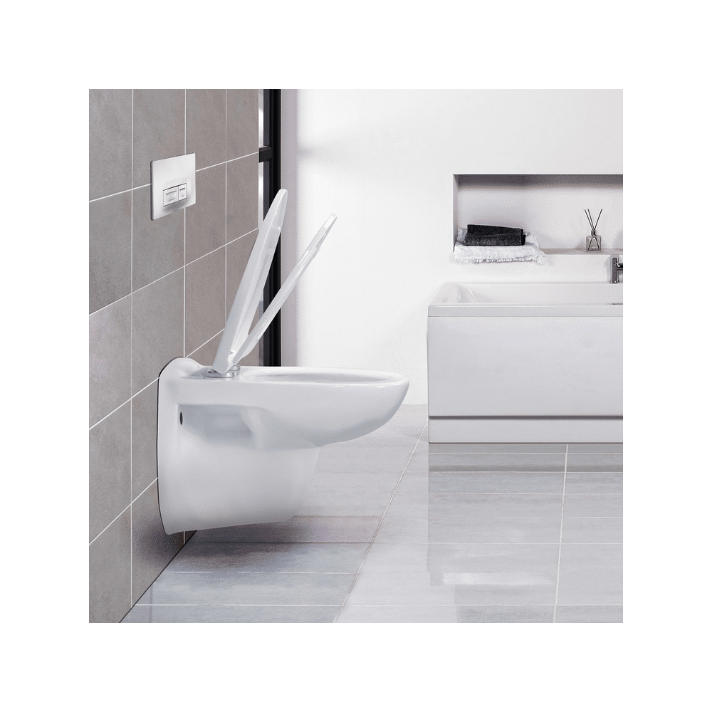 Het toilet wordt geleverd met een thermoplast (PP) softclose zitting die geruisloos sluit. De zitting is afneembaar met quick release, wat het reinigen eenvoudig maakt. Dankzij wandmontage en compacte afmetingen past dit model in diverse badkamerindelingen.