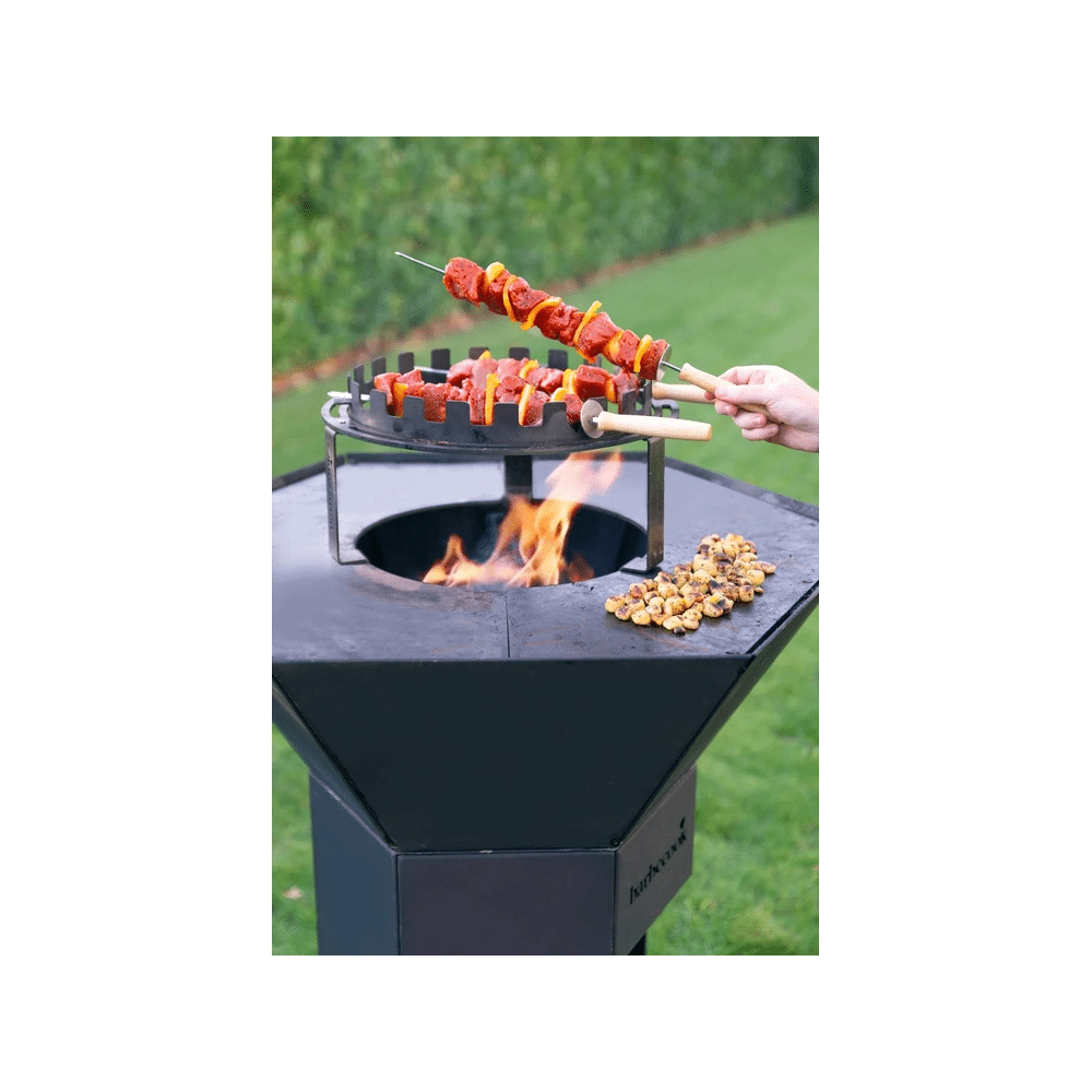 De houder zorgt ervoor dat je spiezen gelijkmatig garen en makkelijk kunnen draaien. Dankzij het slimme ontwerp blijft alles netjes op zijn plaats en vermijd je verbrande stukken of omvallende spiezen.
