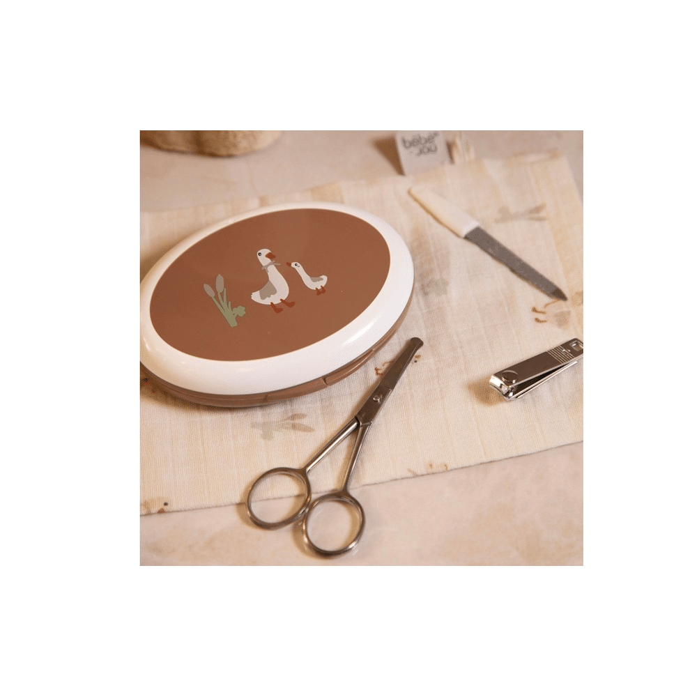 Verzorg de nageltjes van je kleintje veilig en makkelijk met de Bebejou Manicureset Dear Goose. Deze complete set bevat alle tools die je nodig hebt om nagels te knippen, vijlen en verzorgen, speciaal ontworpen voor de gevoelige babyhuid. Het schattige Dear Goose design maakt het verzorgingsmoment extra speels en uitnodigend voor je kleintje, zodat het een rustig en aangenaam ritueel wordt. De lichtgewicht en ergonomische items liggen comfortabel in de hand en zijn eenvoudig te gebruiken en schoon te maken. Zo wordt nagelverzorging een zorgeloos, veilig én vrolijk moment voor jullie beiden.
