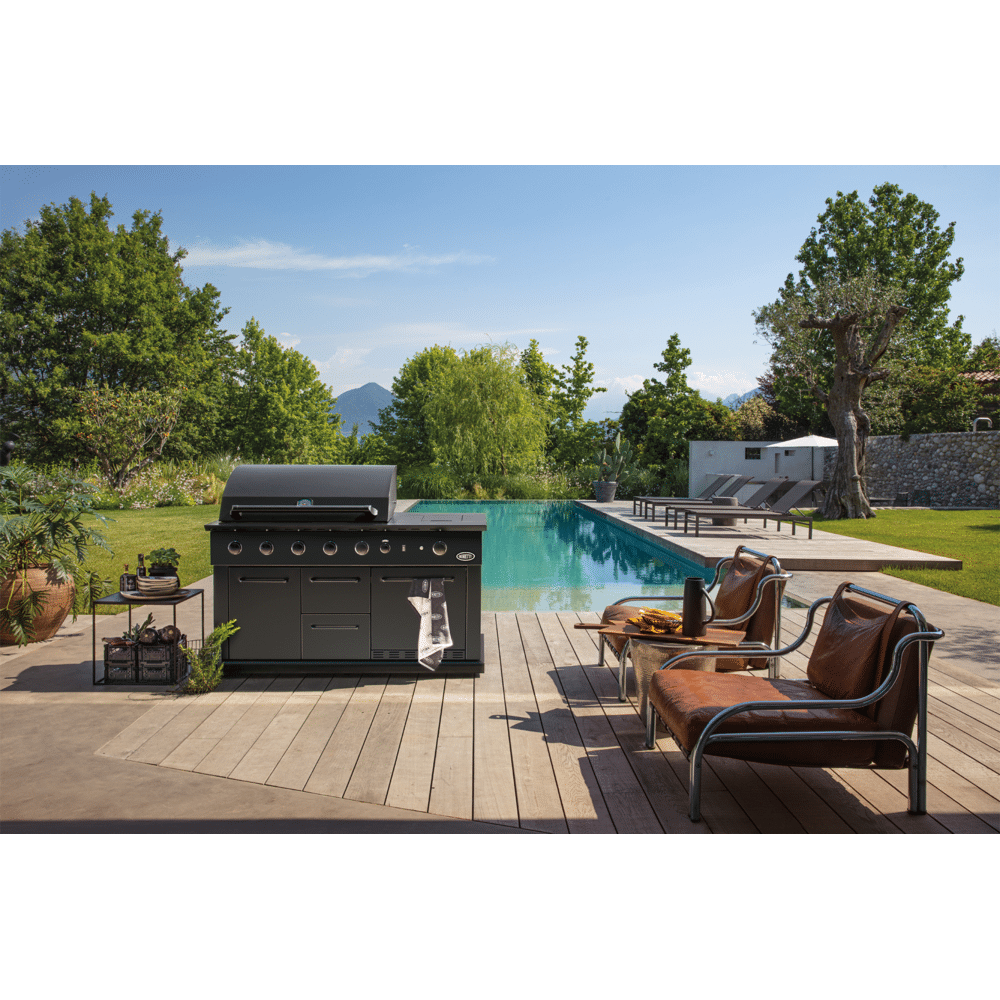 De Boretti Luciano Nero biedt 7 branders, een zijbrander, infraroodwarmte en een geïntegreerde koelkast. Ideaal voor grote gezelschappen en complete culinaire buitenkeukenervaringen.