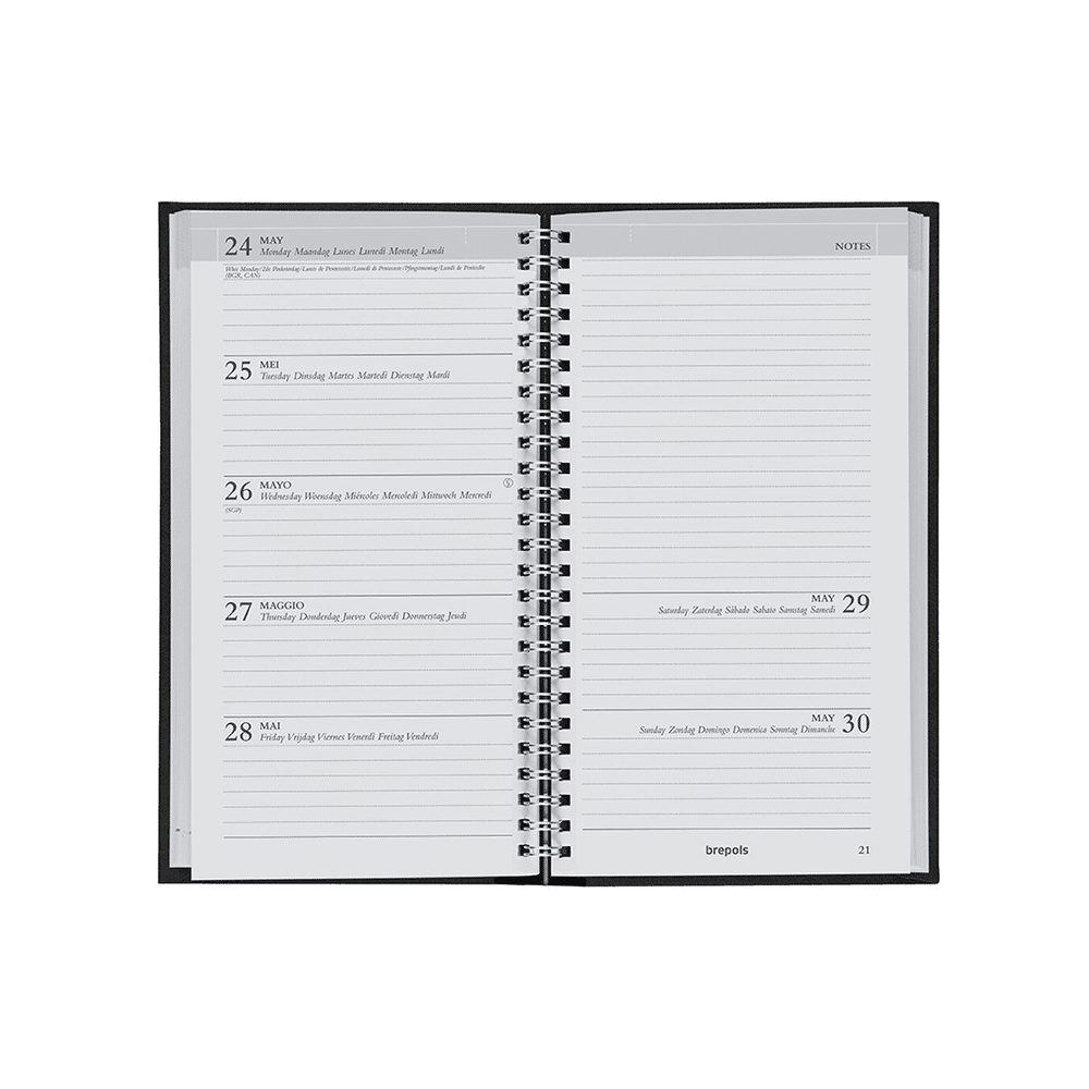 De Brepols Notavision Polyprop agenda is perfect voor wie behoefte heeft aan een functionele en duurzame planner. Deze wire-o agenda biedt een overzicht van 1 week op 2 pagina's, waardoor je voldoende ruimte hebt voor al je afspraken en notities. Het witte papier is gelijnd en voorzien van scheurhoekjes, zodat je eenvoudig ongewenste pagina's kunt verwijderen. Dankzij de stevige kunststoffen omslag is de agenda bestand tegen dagelijkse slijtage, terwijl het handzame formaat van 8,9 x 16 cm het gemakkelijk maakt om de agenda overal mee naartoe te nemen. De agenda is in vier talen beschikbaar, wat het een veelzijdige keuze maakt voor verschillende gebruikers.