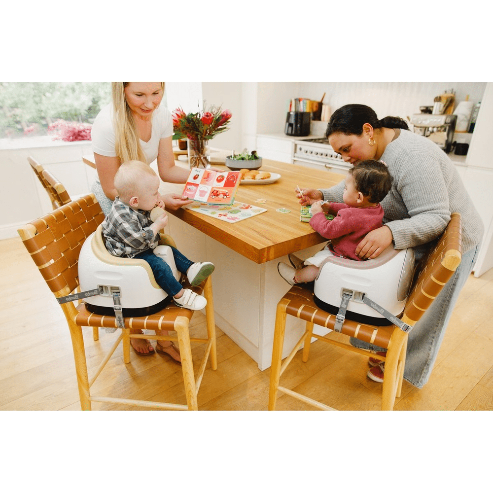 De Multi Seat kan gebruikt worden op de grond of aan tafel met de bijgeleverde riemen. Perfect voor thuis, bij bezoek of onderweg, ideaal tijdens maaltijden, spel of rustmomenten.