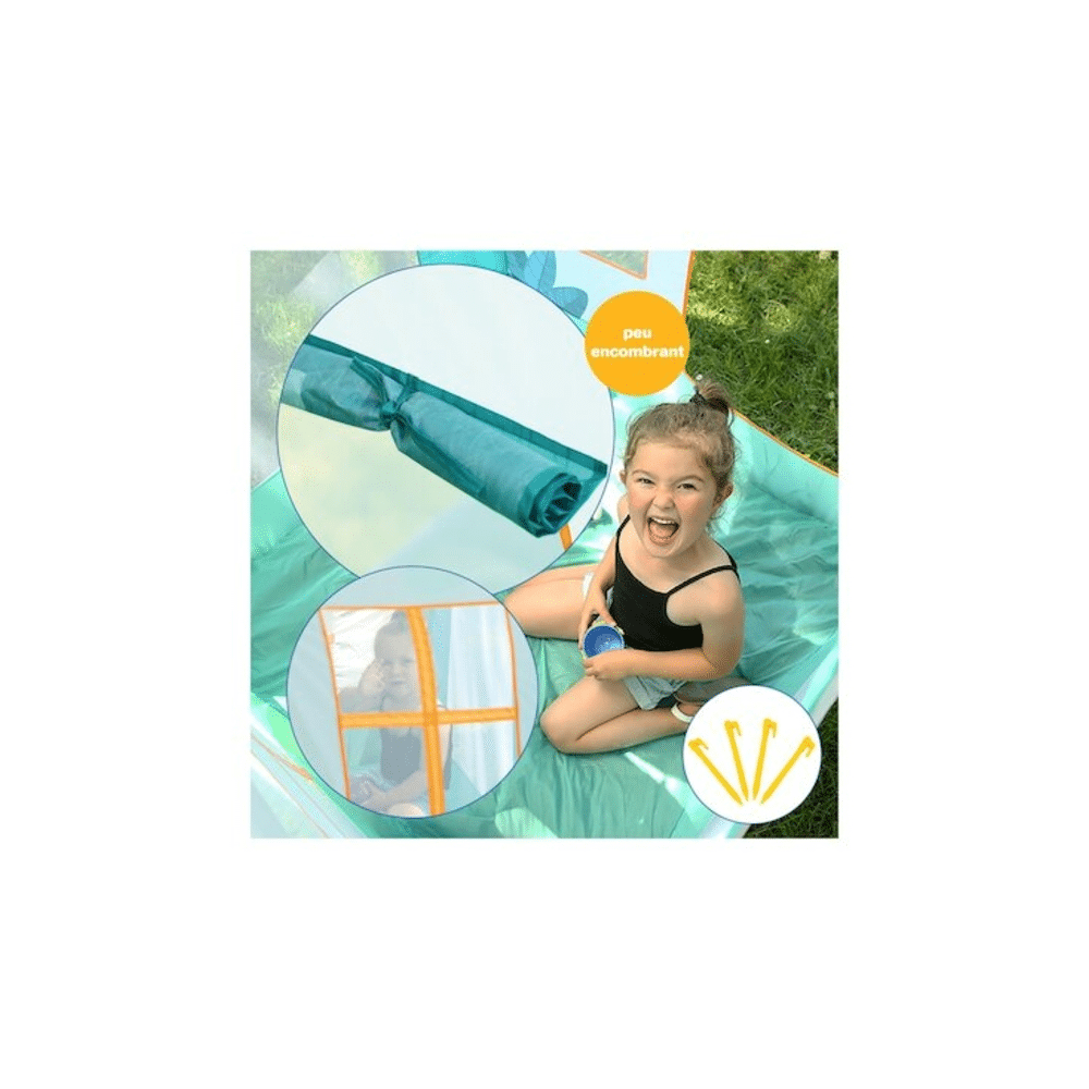 Dankzij het UV-beschermend polyester dak spelen kinderen veilig in de zon. De ventilatienetten zorgen voor frisse lucht, terwijl de openingen met gordijnen zorgen voor een gezellige en afgeschermde speelruimte.