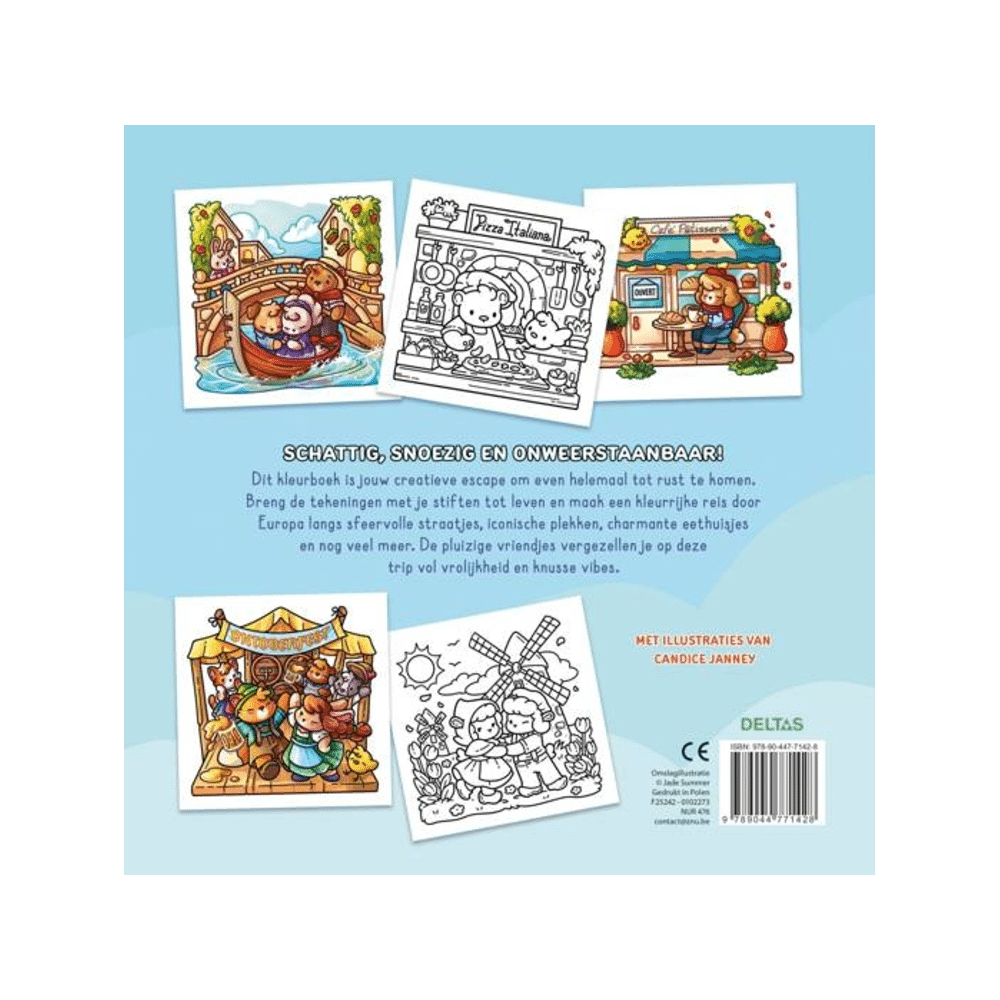 Van wafels eten op de Grote Markt in Brussel tot fietsen door Amsterdam of een Vespa-rit door Italië: elk van de 40 handgetekende kleurplaten neemt je mee naar een andere sfeervolle Europese plek. Pluizige reisgenootjes begeleiden je op elke pagina.