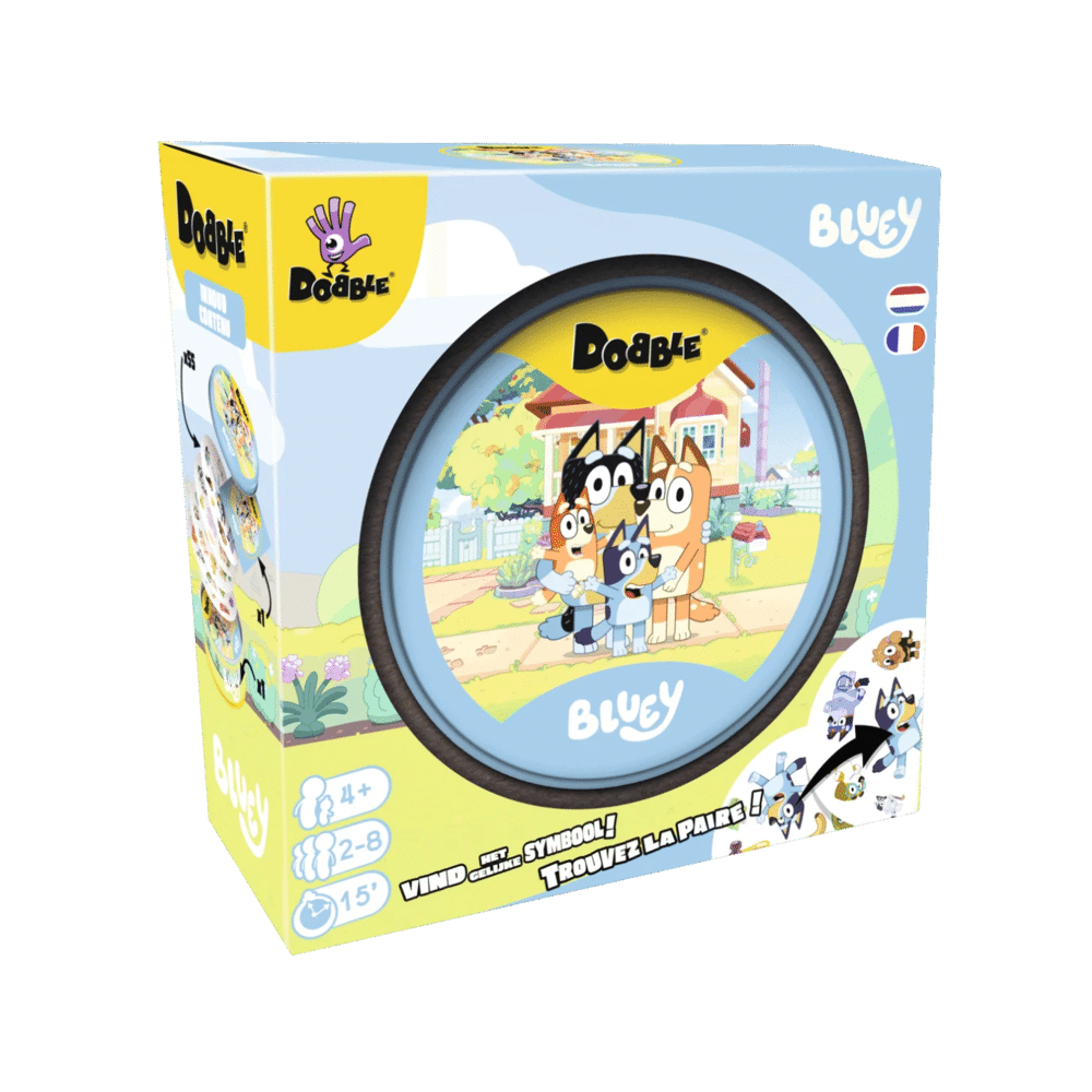 Ontdek het Dobble Bluey spel, het vrolijke kaartspel voor kids en gezinnen.Herken het juiste symbool sneller dan de rest en win.
