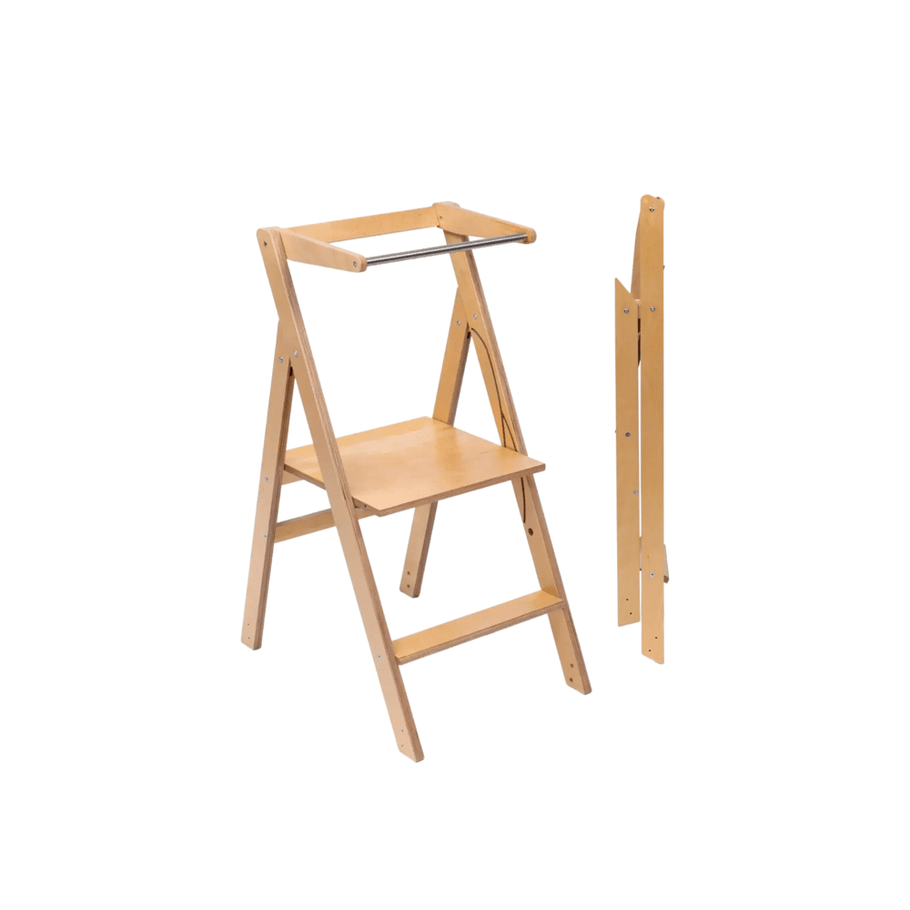 Een slimme, houten leertoren die je makkelijk openplooit zodat je kind veilig kan meehelpen in de keuken of badkamer.Waarom kies jij deze plooibare leertoren?
