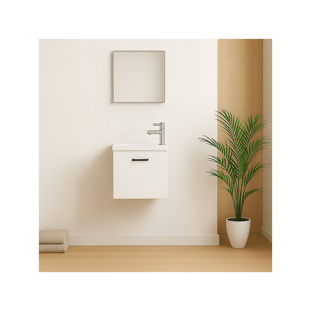 Het Ovi fonteinmeubel is de ideale compacte oplossing voor toilet of kleine badkamer. Dankzij de frisse lakwitte afwerking oogt het modern, licht en stijlvol, terwijl het subtiele ontwerp mooi aansluit bij elke interieurstijl. Met de inbegrepen wastafel en spiegel creëer je in één keer een complete en gebruiksklare set. Het meubel is onderhoudsvriendelijk en biedt voldoende ruimte voor kleine toiletartikelen, zonder de ruimte te overweldigen.