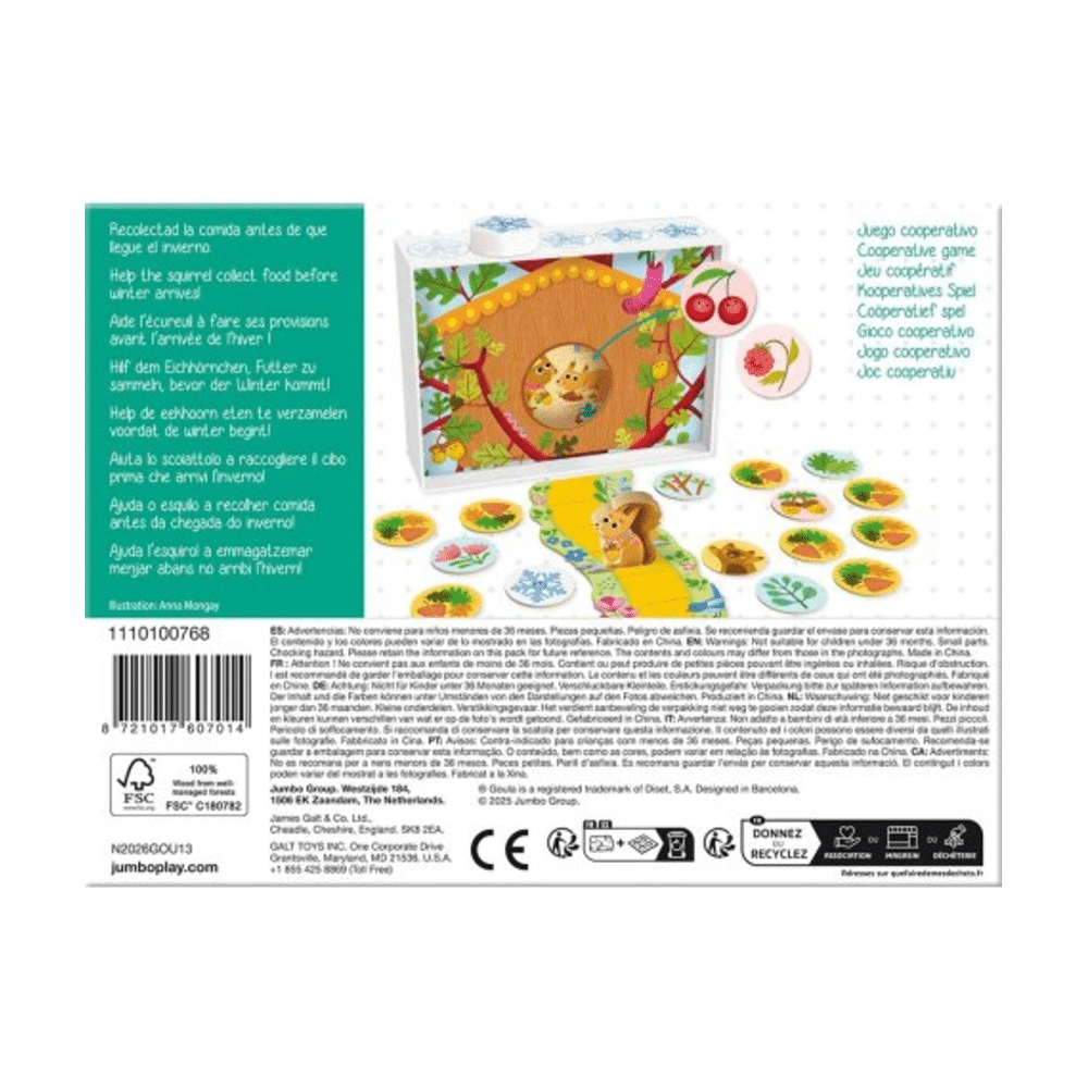 Alle spelers werken als één team om de eekhoorn te helpen. Verzamel noten, eikels en ander lekkers voordat de winter begint. Het spel duurt ongeveer 15 minuten en is perfect voor 1 tot 4 spelers vanaf 3 jaar.Welke vaardigheden leren kinderen?