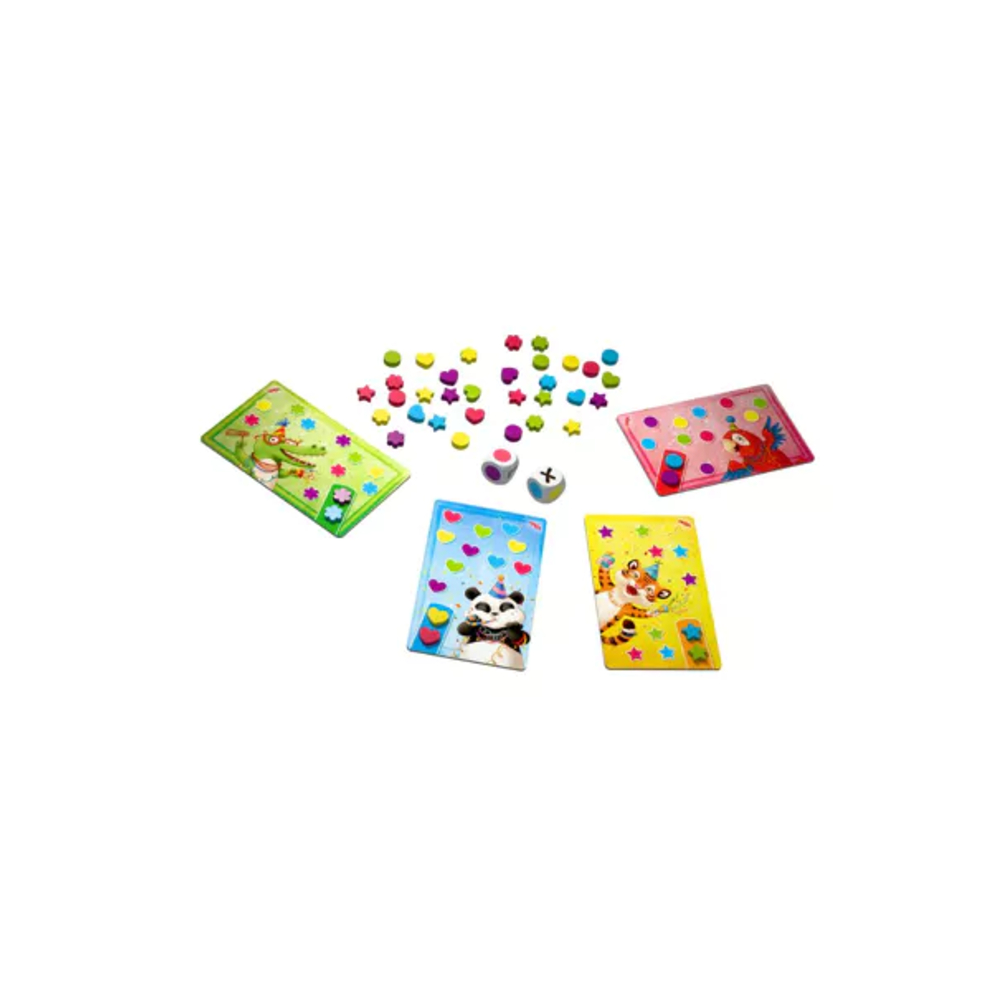 • Inhoud: 4 dierenkaarten, 40 houten confettistukken (10 sterren, 10 schijven, 10 harten, 10 bloemen), 2 dobbelstenen, 1 spelhandleiding