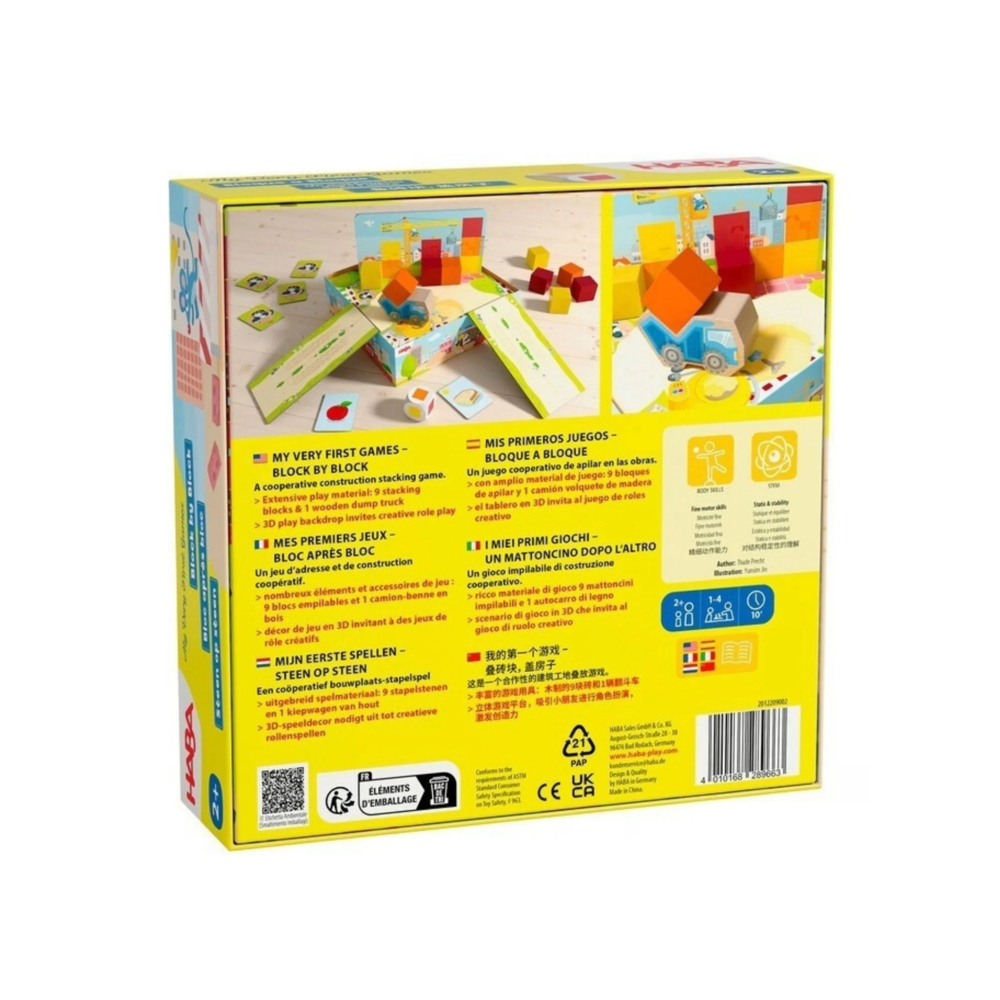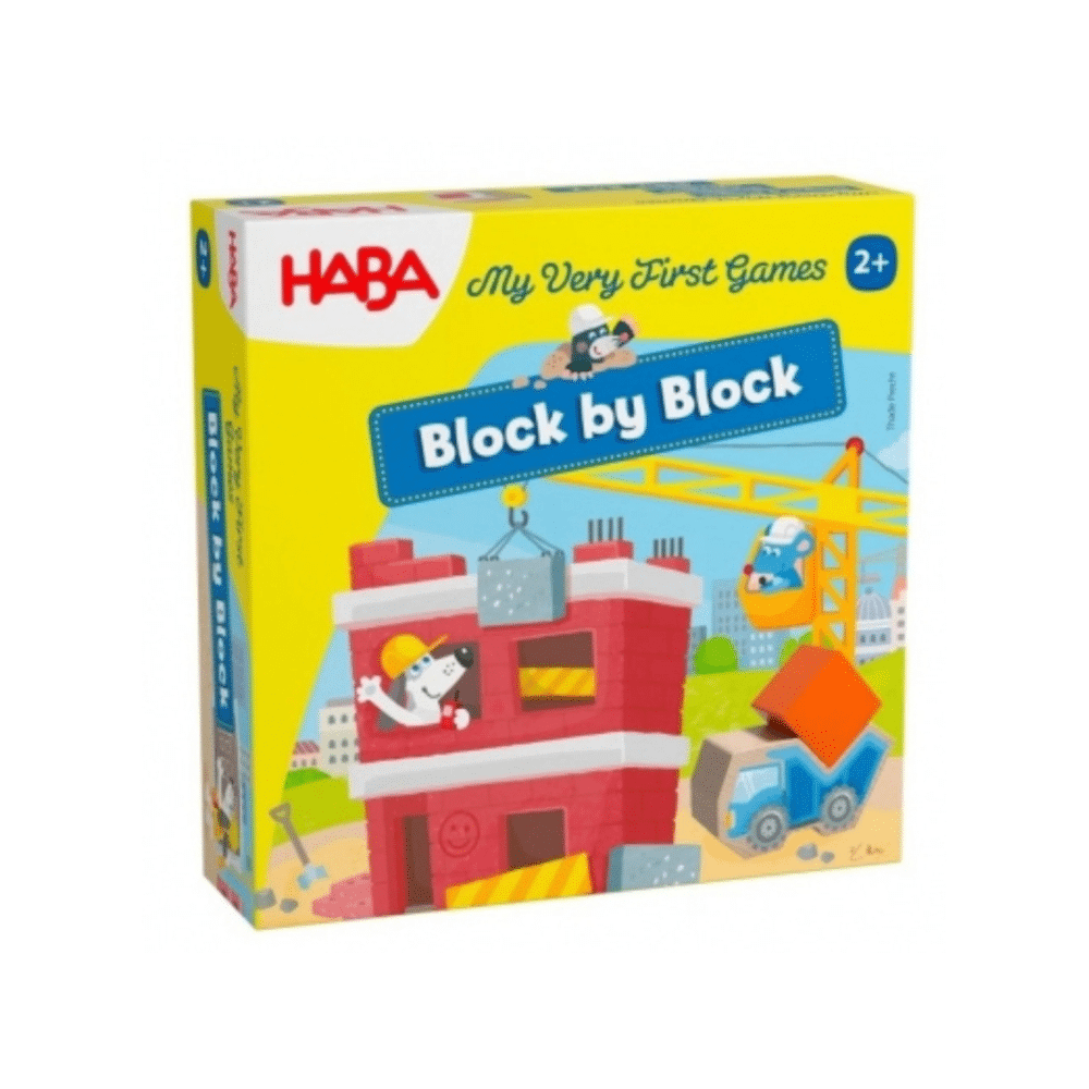 My First Games: Block by Block van HABA laat jonge bouwers op speelse wijze de wereld van bouwen ontdekken. Overal verrijzen huizen, verdieping voor verdieping, en met elke zet groeit het plezier. De kinderen helpen enthousiast mee door de bouwblokken met de kiepwagen naar de juiste plek te brengen – zo leren ze samenwerken, tellen en plannen terwijl ze spelen.