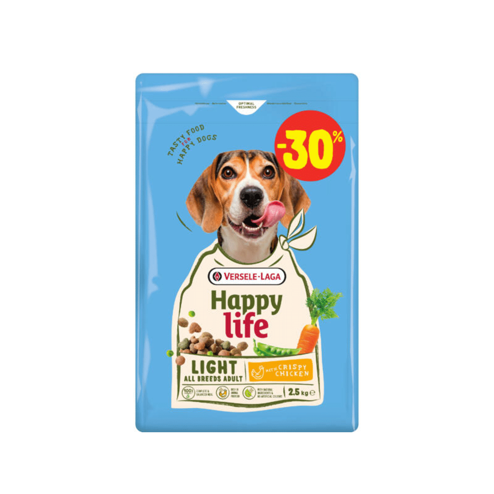 Met Happy Life Adult Mini Light Kip kies je voor gezonde, lichte brokjes én een mooie bonusportie van 0.75 kg extra.