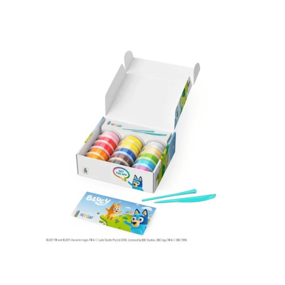 De Hey Clay Set Met 15 Potjes Air-dry Boetseerklei Limited Edition Bluey En Vriendjes is de perfecte creatieve set voor Bluey-fans. Maak, speel en geniet van kleurrijk knutselplezier!