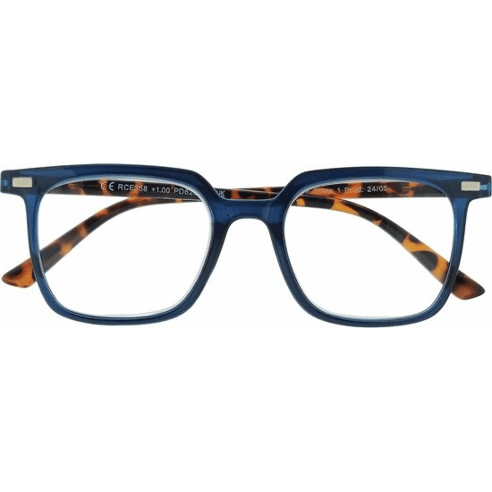 Deze leesbril +1.00 heeft een vierkant montuur met een trendy blue tortoise patroon. Ideaal voor wie een tijdloos design wil met een subtiel kleurrijk accent.