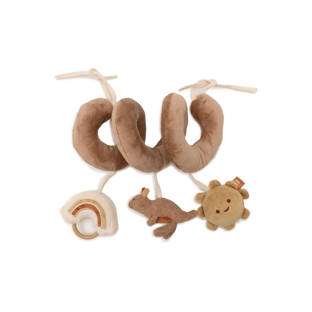 Deze vrolijke activiteitenspiraal uit de Kangaroots collectie maakt elke autorit of boxmoment een feestje. Met een lief zonnetje, speelse kangoeroe en kleurrijke regenboog heeft jouw baby altijd iets leuks te ontdekken. De spiraal zit boordevol verrassingen zoals een spiegeltje, knisperfolie en een belletje dat zachtjes rinkelt. Handig: dankzij de stevige lusjes aan beide uiteinden bevestig je hem makkelijk aan de maxi cosi, box of kinderwagen. Afmetingen: 35 x 9 x 28 cm.Waarom is deze spiraal zo leuk voor mijn baby?