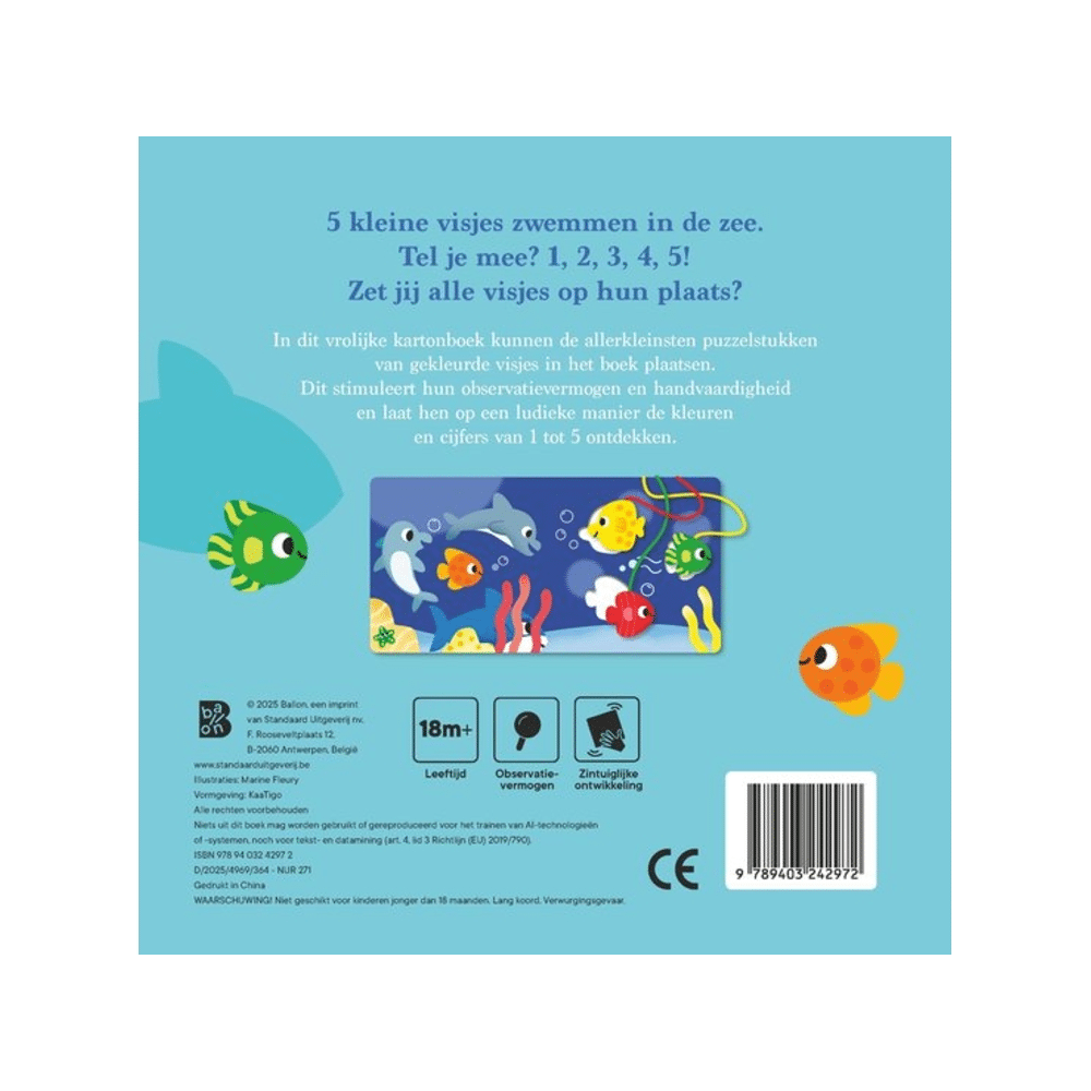 Stevig boek met kartonnen pagina’s en puzzels over kleine vissen. Stimuleert fijne motoriek, logisch denken en plezier in spelenderwijs leren.