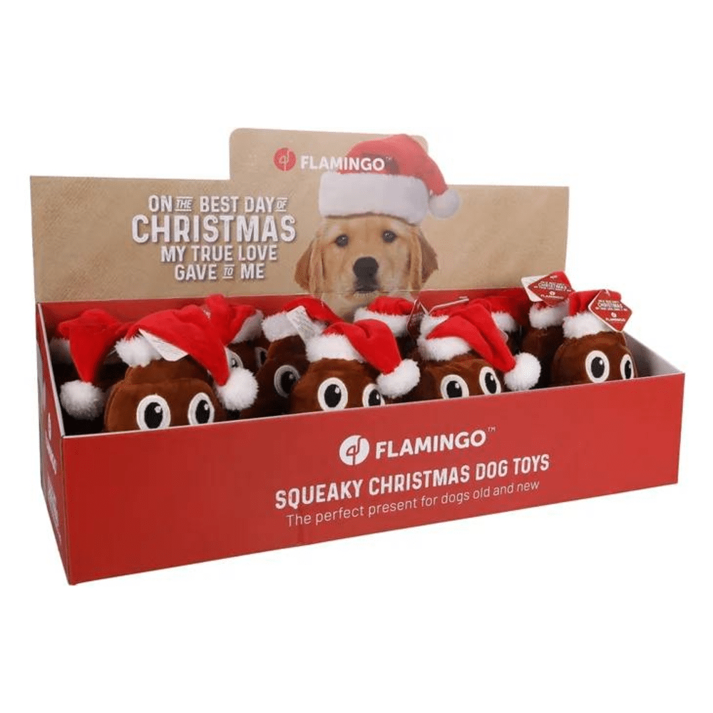 Het Kerst Hs Droppa Lachend Kakje Bruin van 13,8x8x28cm biedt veilig, vrolijk en grappig speelplezier tijdens de feestdagen voor je huisdier of als humoristische decoratie.