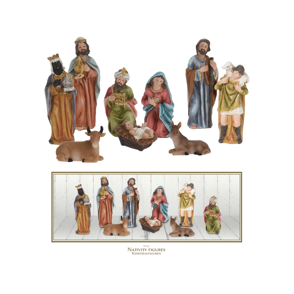 Deze geweldige set bedraagt van 9 kerstfiguren die enig zijn om als decoratie te plaatsen in/ op een kast of onder de kerstboom te plaatsen. De beeldjes zijn ongeveer 10 cm en zijn gemaakt van polystone, dit is minder snel breekbaar en kun je er dus langer van genieten!