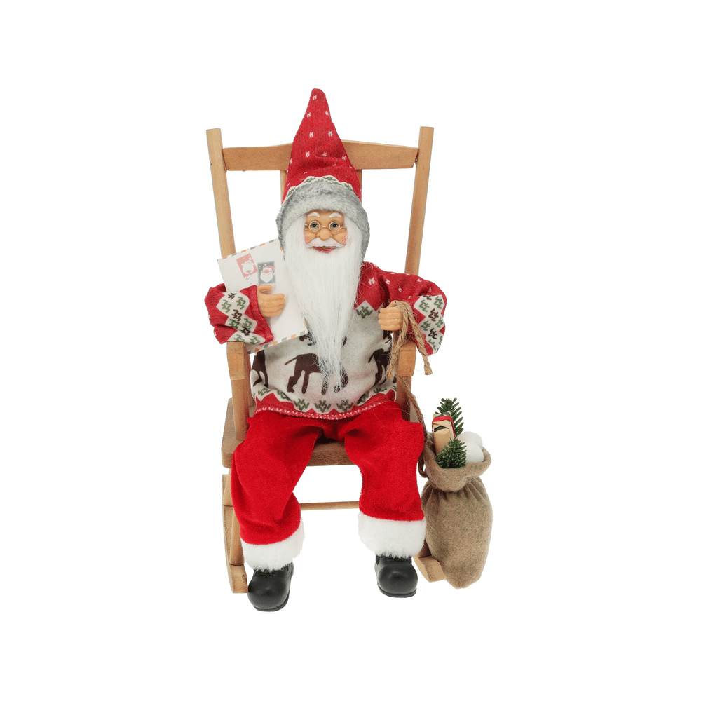 Een Kerstman die niet alleen kijkt, maar ook swingt? Ja hoor! Deze gezellige kersthulp op zijn schommelstoel (35 cm hoog!) brengt instant sfeer in je woonkamer, winkel of bureau.De perfecte mix van een knusse Scandinavische stijl en dat warme, nostalgische kerstgevoel. Zet hem naast je boom, bij de open haard of midden in je etalage — succes verzekerd!