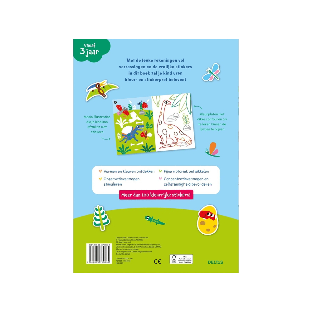 Laat de creativiteit van je kleuter los met dit vrolijke kleur- en stickerboek vol schattige dino’s! Meer dan 100 kleurrijke stickers en dikke kleurplaten zorgen voor uren plezier — perfect voor nieuwsgierige kinderhandjes vanaf 3 jaar.Kleuren, plakken en groeien