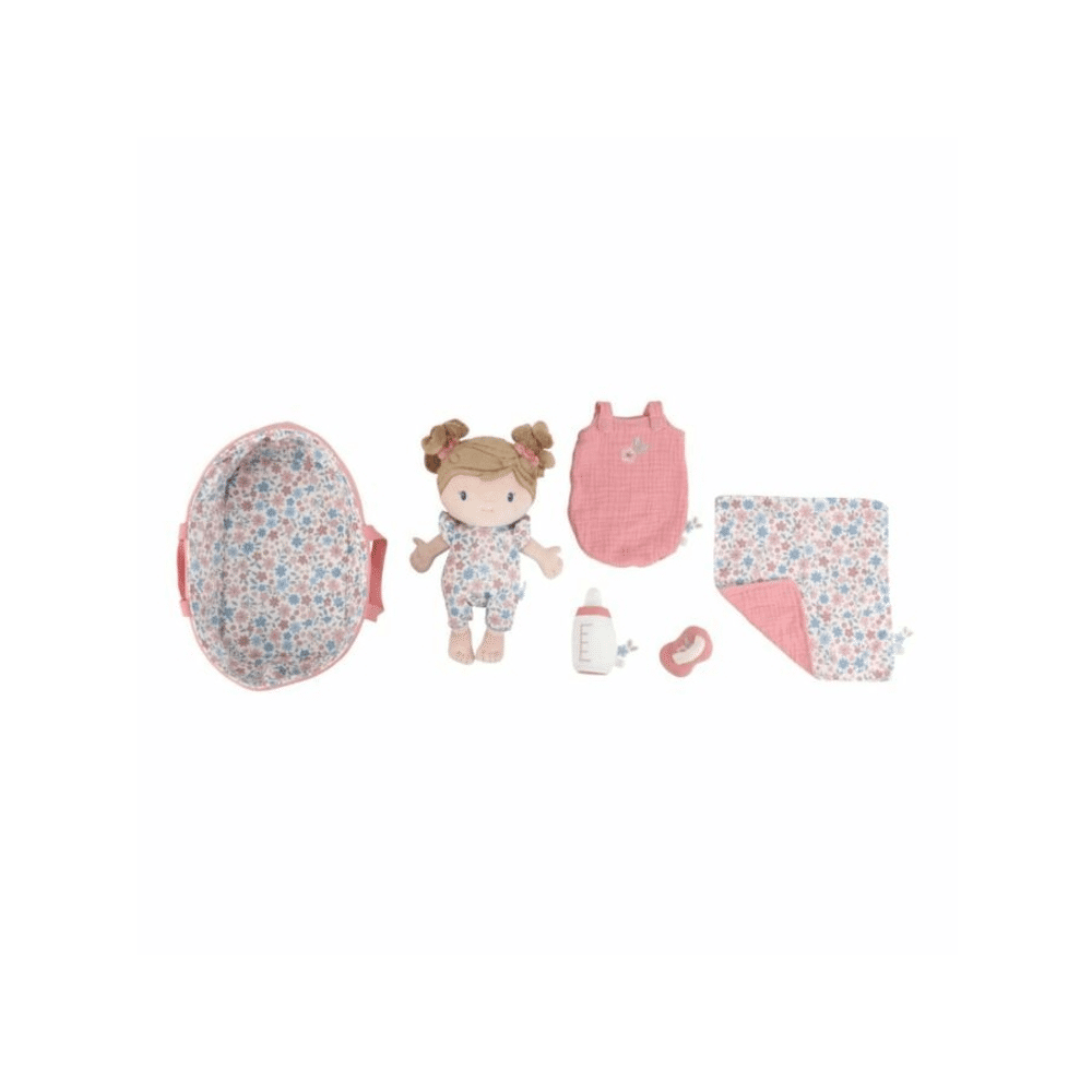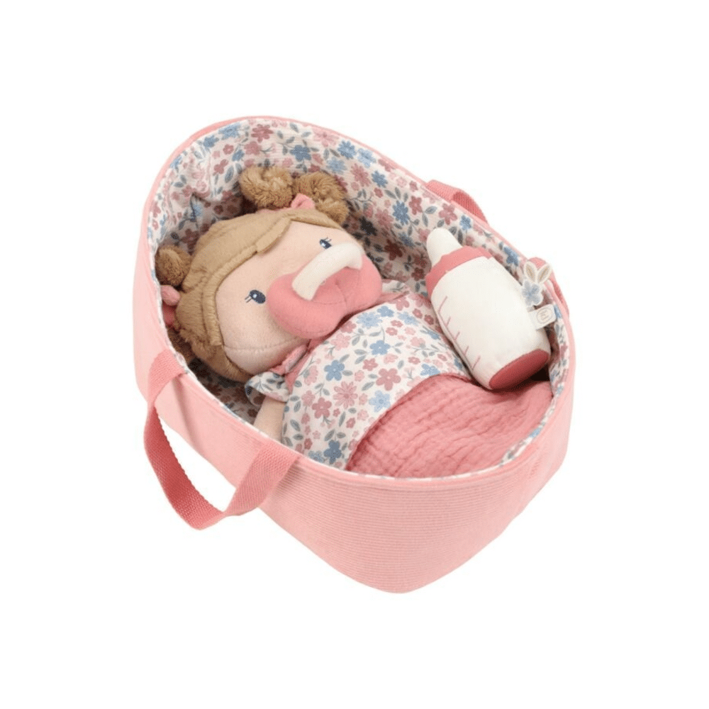 De Little Dutch Babypop Rosa In Mandje is een zachte en lieve metgezel voor kinderen om mee te knuffelen en verzorgen.
