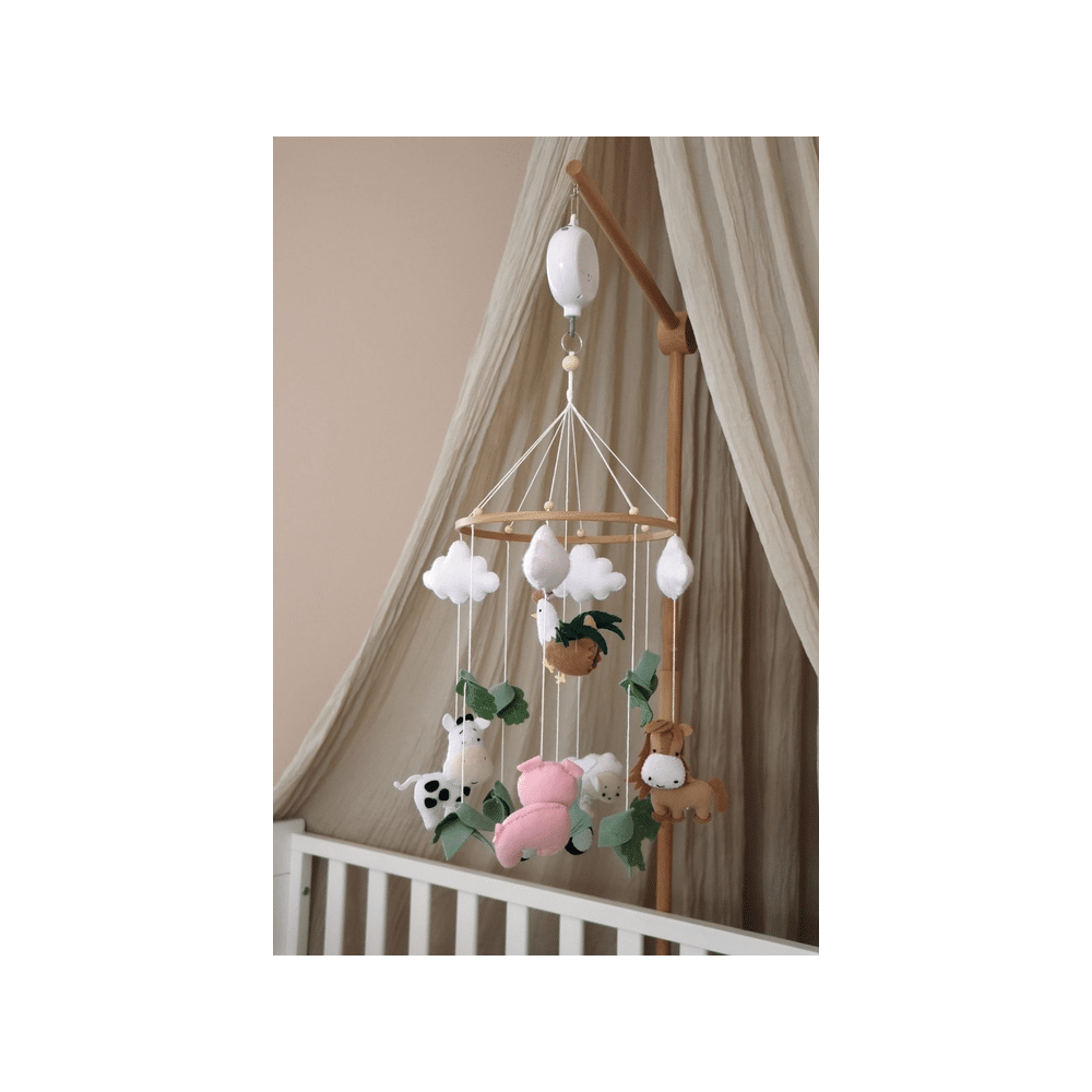 Breng het platteland tot leven in de kinderkamer met de Little Loua Mobiel Farm, volledig met de hand gemaakt. Deze charmante mobiel toont schattige boerderijdieren die zachtjes wiegen in de lucht en zo een vrolijke, speelse sfeer creëren. Perfect boven een wiegje, bed of speelhoek, deze handgemaakte mobiel combineert vakmanschap met een warm, kindvriendelijk ontwerp. Het lichte, zorgvuldig afgewerkte materiaal maakt het eenvoudig om de mobiel op te hangen, terwijl de zachte kleuren een gezellige en uitnodigende uitstraling geven. Voeg een uniek, handgemaakt accent toe dat elke kamer omtovert tot een knusse, magische plek.