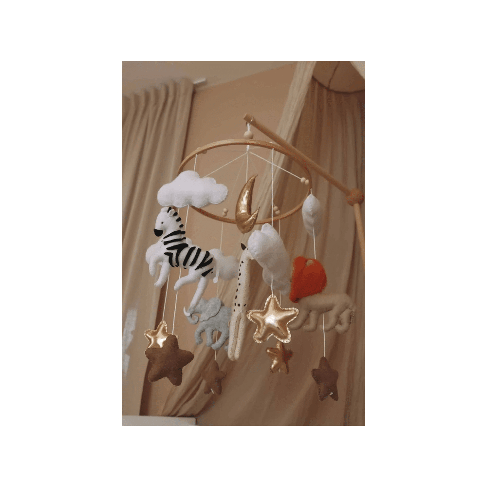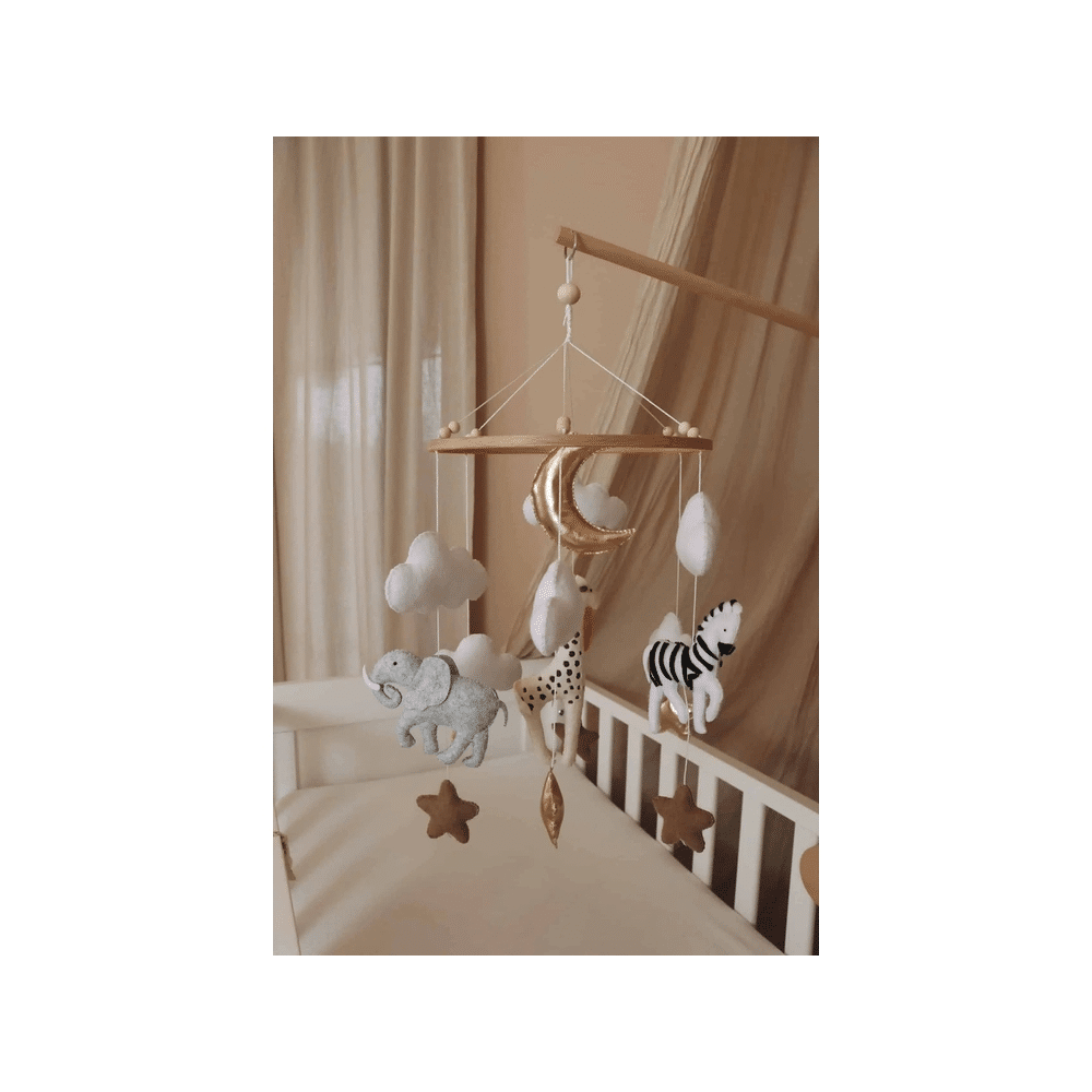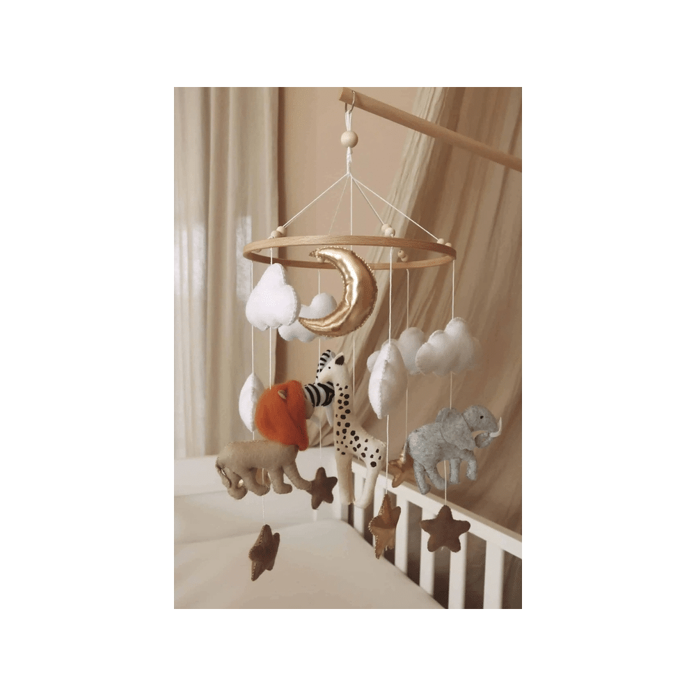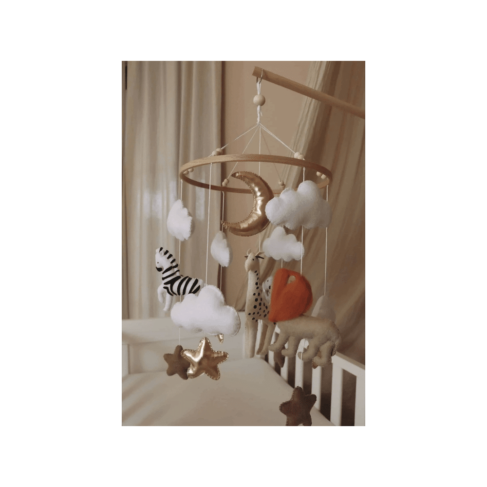 Breng een avontuurlijke safarisfeer in de kinderkamer met de Little Loua Mobiel Safari, volledig met de hand gemaakt. Schattige wilde dieren zoals olifanten, giraffen en leeuwen wiegen zachtjes in de lucht en creëren een speels en magisch decor voor jouw kindje. Perfect boven een wiegje, bed of speelhoek, deze handgemaakte mobiel combineert vakmanschap met een charmant, kleurrijk ontwerp dat elke ruimte tot leven brengt. Het lichte materiaal maakt het eenvoudig om de mobiel op te hangen, terwijl de zachte, natuurlijke kleuren zorgen voor een gezellige en uitnodigende sfeer. Laat jouw kamer veranderen in een mini-safari vol plezier en verbeelding.