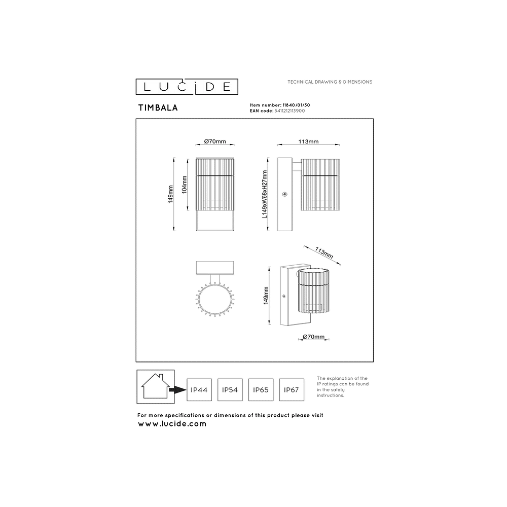 Dankzij de IP44-classificatie is de TIMBALA bestand tegen regen en vocht, waardoor deze wandspot perfect geschikt is voor langdurig gebruik buitenshuis. Compact en elegant met afmetingen van 11,3 x 7 x 14,9 cm.