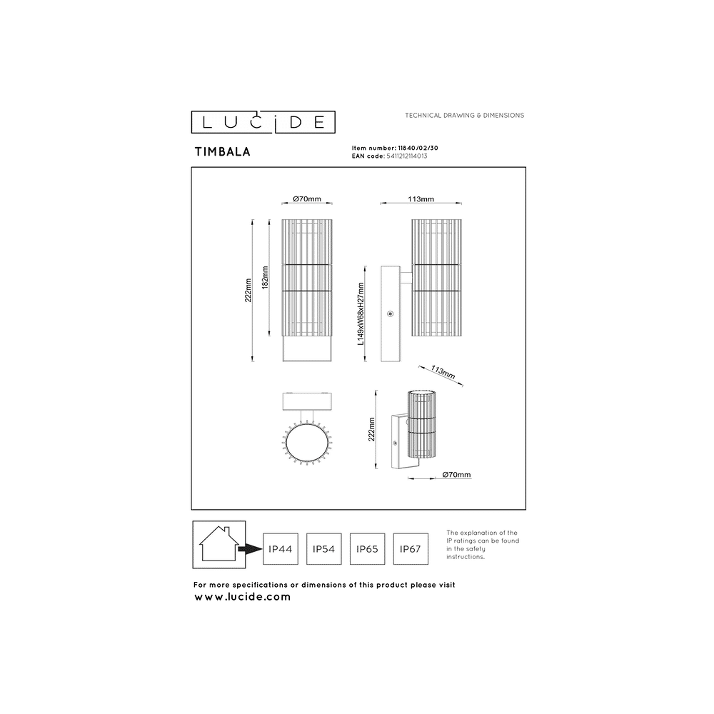 Met afmetingen van 11,3 x 7 x 22,2 cm biedt TIMBALA krachtige, diffuse verlichting die je gevel, tuinmuur of entree elegant verlicht. Een praktische en stijlvolle toevoeging voor elk buiteninterieur.