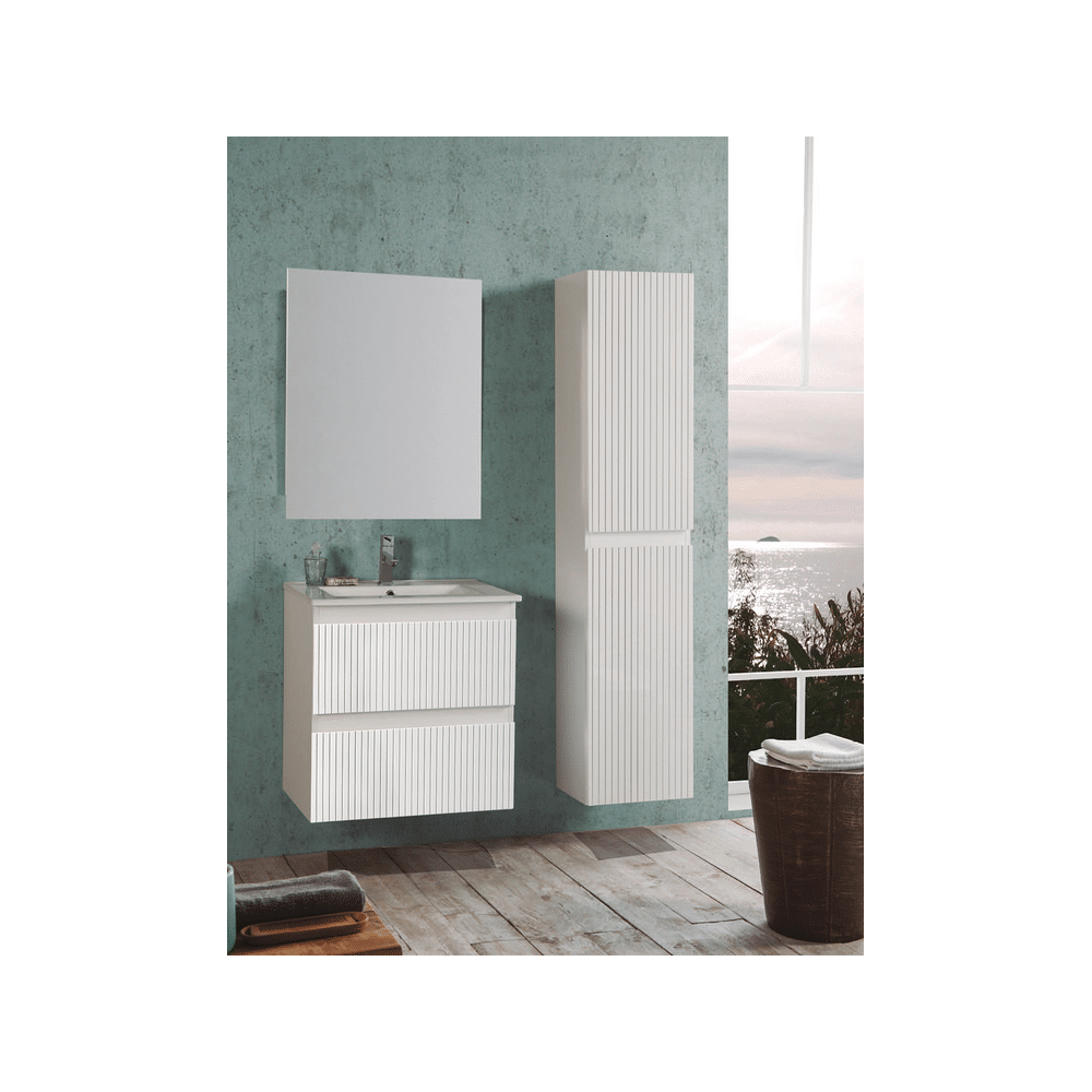 Deze Manhattan meubelset combineert een strak design met praktische opbergruimte. De witlakglans afwerking en subtiele groeven geven het meubel een moderne uitstraling. Met twee ruime lades, een bijpassende wastafel en een spiegel vormt deze set een complete en stijlvolle oplossing voor je badkamer.