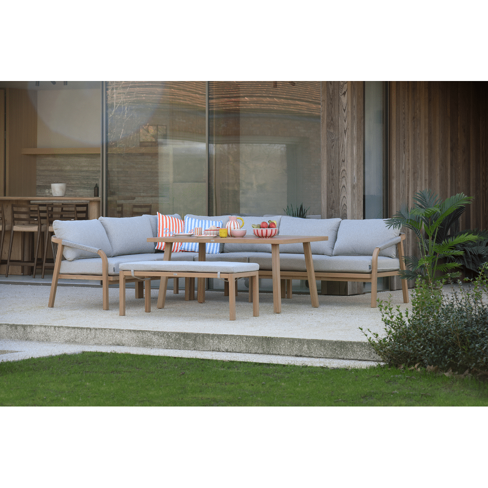 Het lichte teaklook frame is duurzaam en onderhoudsvriendelijk, terwijl het sand rope materiaal een stijlvolle, luchtige look geeft. De donkere kussens bieden extra comfort en maken deze set ideaal voor lange diners, relaxmomenten of gezellige borrels met vrienden en familie.