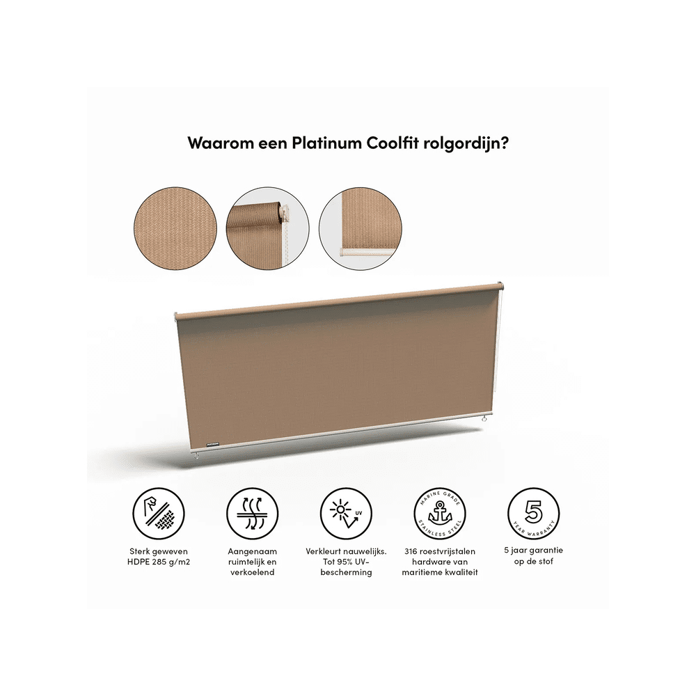 Met het Platinum Coolfit rolgordijn breed 2,96 x 2,4m in zand kies je voor maximale schaduw, privacy en een stijlvolle, warme uitstraling.Geniet van je terras of veranda, zelfs op de heetste dagen.