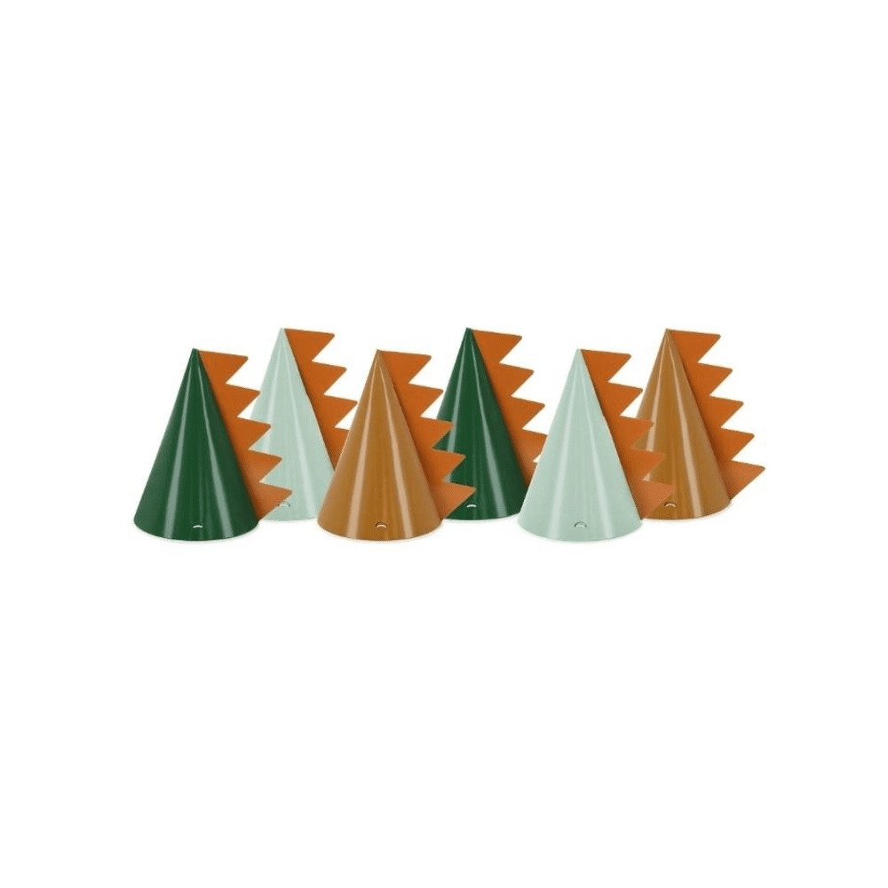 De set bevat 6 hoedjes in verschillende kleuren en designs. Ideaal voor kleine feestvierders en eenvoudig te combineren met andere dinosaurusdecoraties voor een compleet thema.