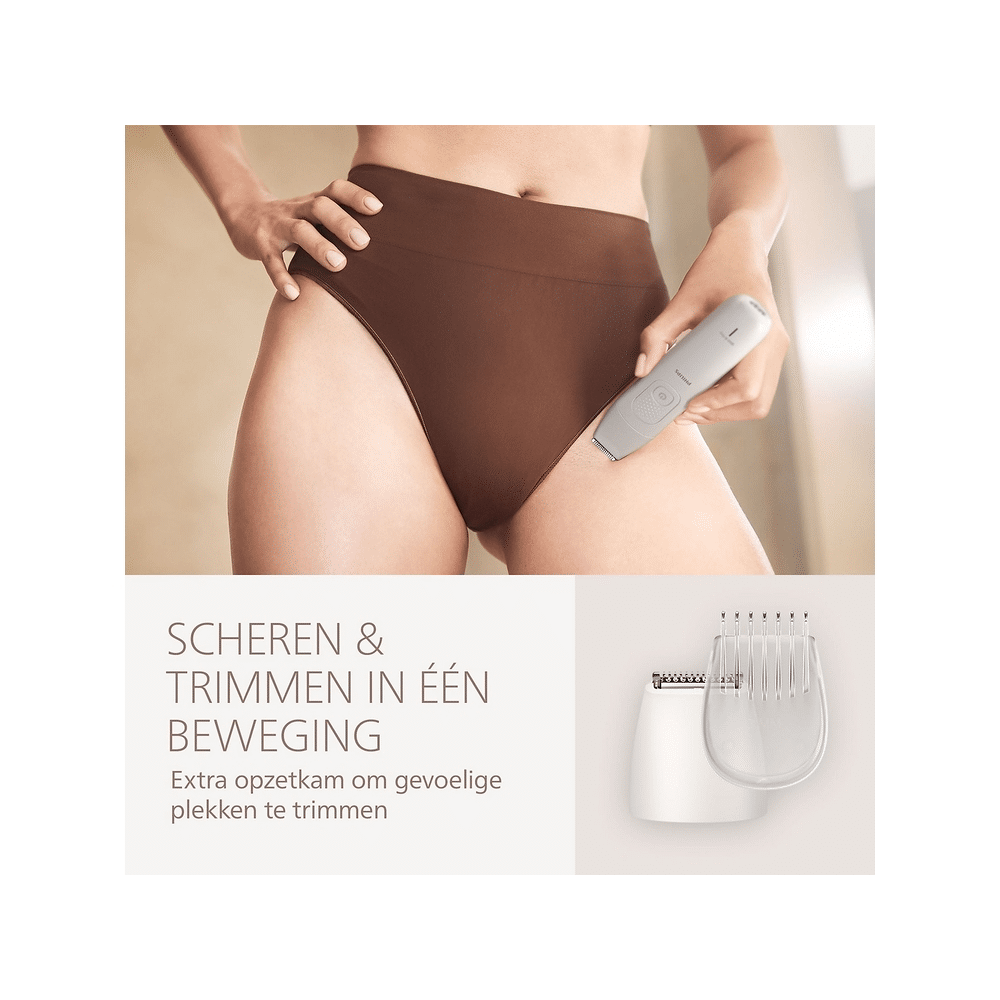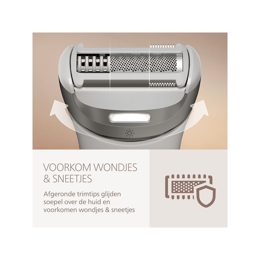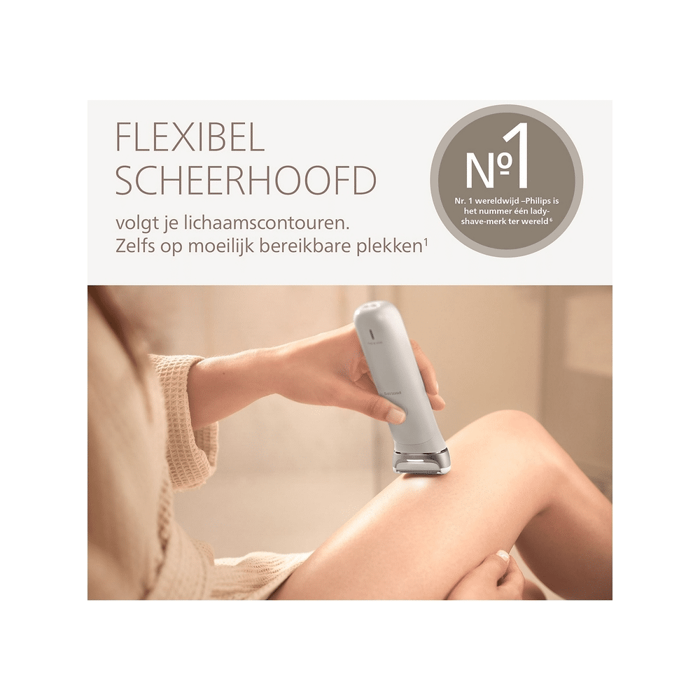 De flexibele scheerkop volgt moeiteloos de contouren van jouw lichaam. Zo scheer jij glad en precies, zonder irritatie of sneetjes, zelfs op moeilijk bereikbare plaatsen.
