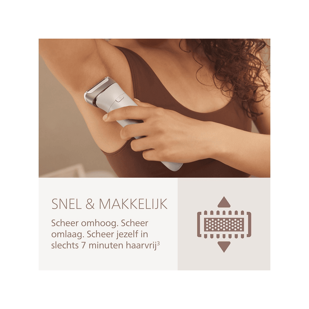 Deze Lady Shaver Series 8000 biedt jou een zachte, flexibele en efficiënte scheerervaring. Perfect voor dagelijkse verzorging met een glad resultaat.