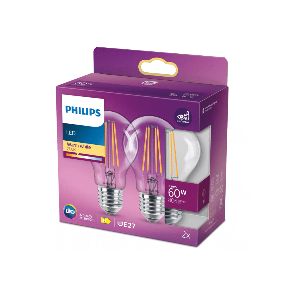 - Philips Led Classic 60w A60 E27 Warm Wit Clear Niet Dimbaar 2-Pack