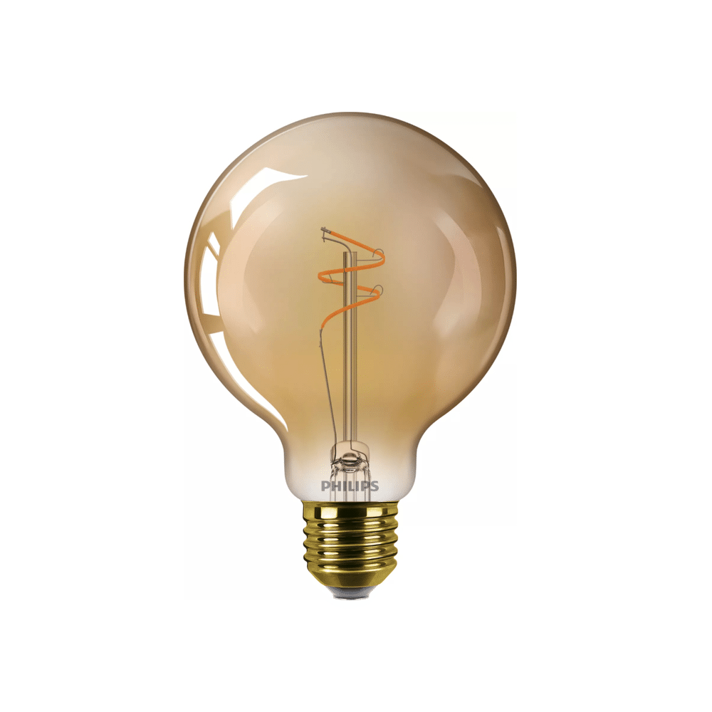 De Philips Filamentlamp amberkleurig 25W G95 E27 biedt een elegante, warme verlichting met een vintage look en duurzaam LED-licht, perfect voor een gezellige en sfeervolle ambiance.