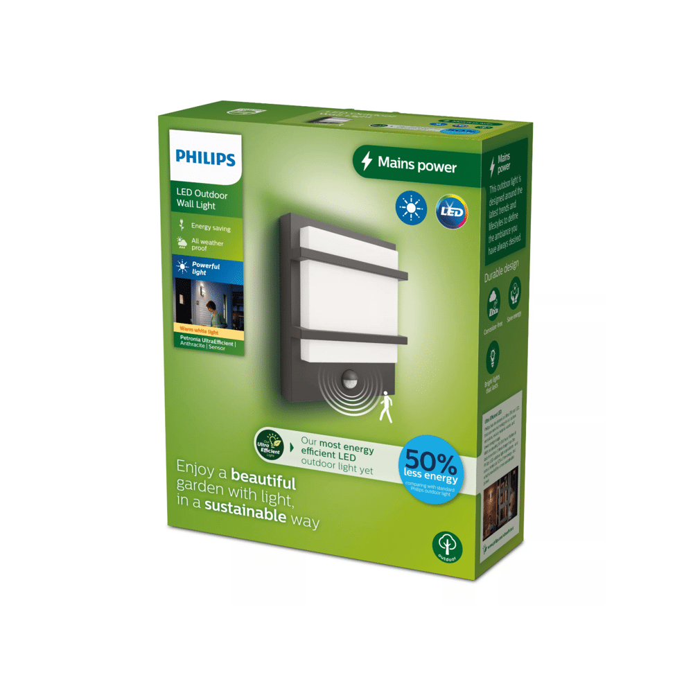 Laat je tuin baden in een warme gloed met de Philips Petronia wandlamp. Deze moderne buitenlamp combineert elegant design in antracietgrijs met indrukwekkende energiezuinigheid. Dankzij de Ultra Efficient LED-technologie geniet je van prachtig licht, een lagere energierekening en een kleinere ecologische voetafdruk.