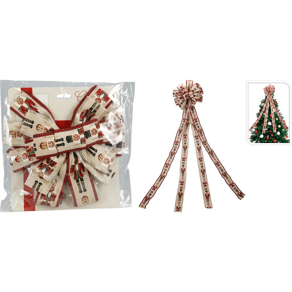 Laat je kerstboom schitteren met deze unieke kerststrik van 130 cm! De elegante strik met speelse linten en klassiek notenkrakerdesign is dé eyecatcher voor wie houdt van nostalgie, charme en een tikkeltje drama in huis.Een kersttopper met karakter