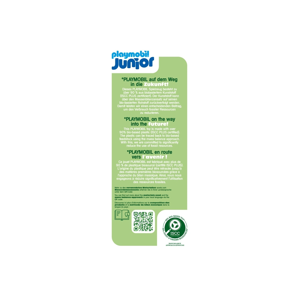 PLAYMOBIL JUNIOR is speciaal ontworpen voor kleine handjes en is BPA-vrij en zonder inslikbare kleine onderdelen. De sets worden gemaakt van meer dan 90% biogebaseerd plastic met ISCC PLUS-certificering voor een duurzamere toekomst.