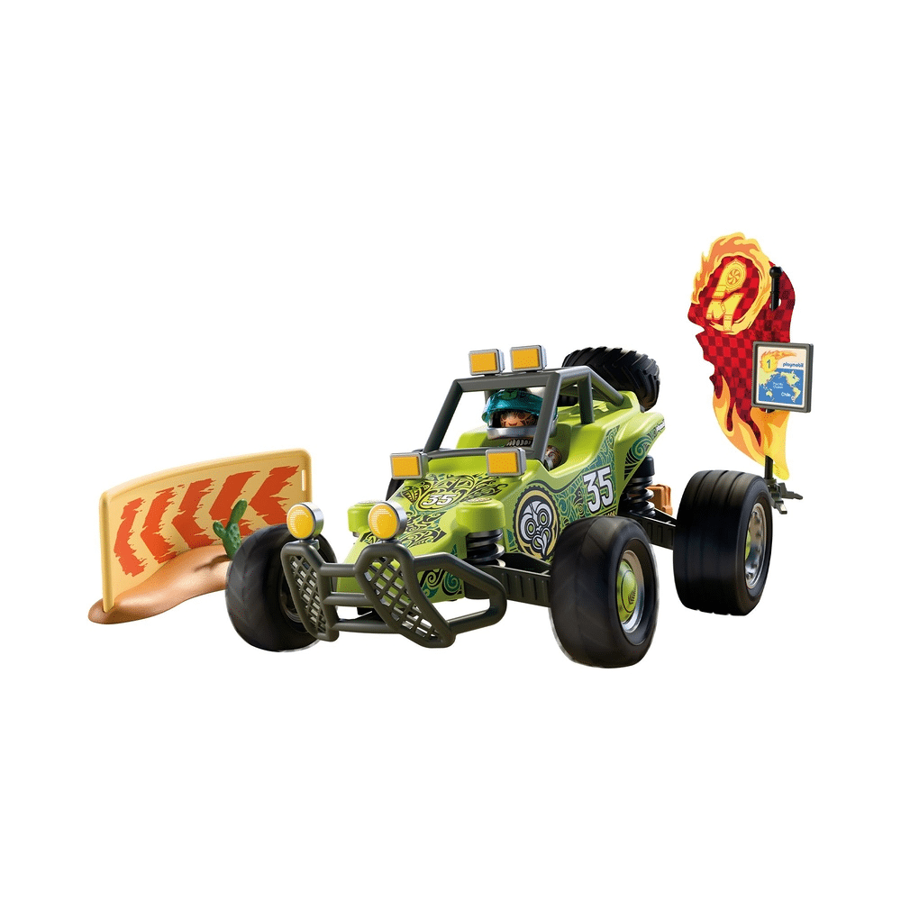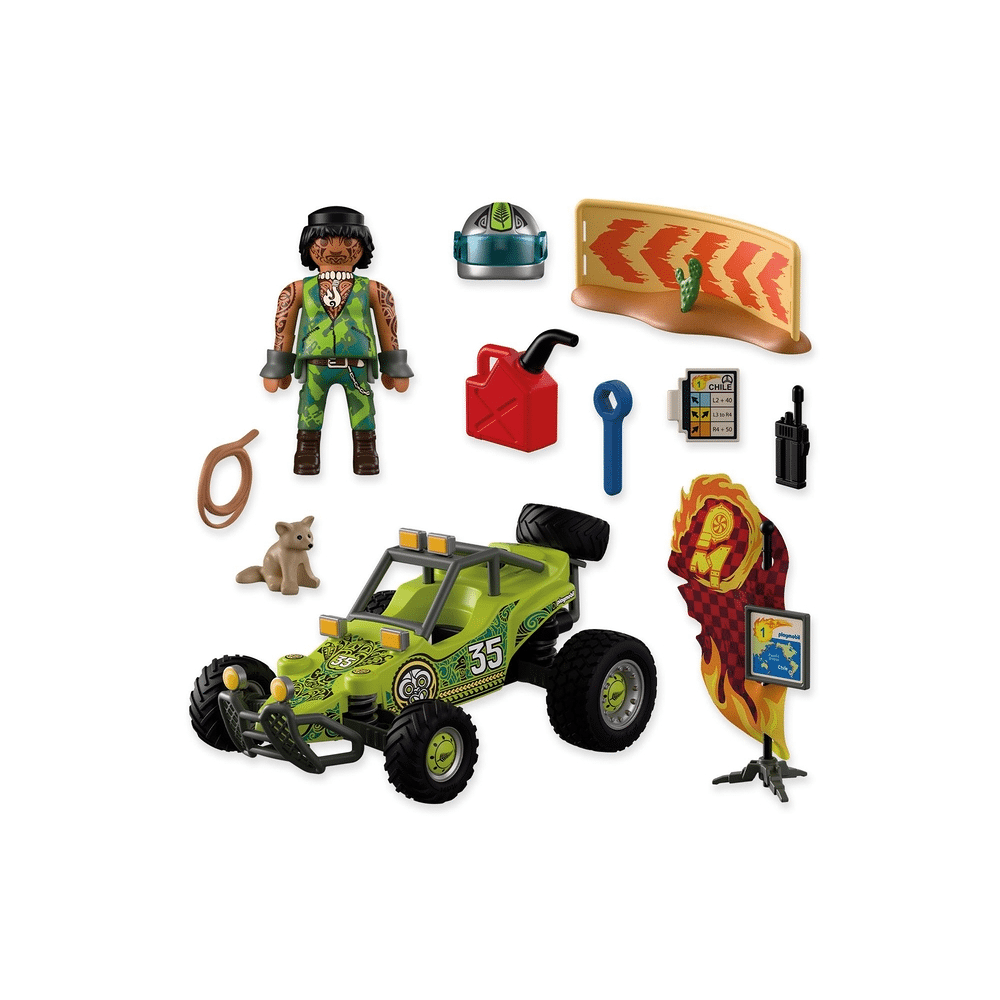 Voel de spanning van de woestijnetappe met de Playmobil 72063 Offroad Buggy. De Nieuw-Zeelandse coureur trotseert rotsachtige heuvels, stuivend zand en woestijnvossen in een buggy vol coole accessoires.