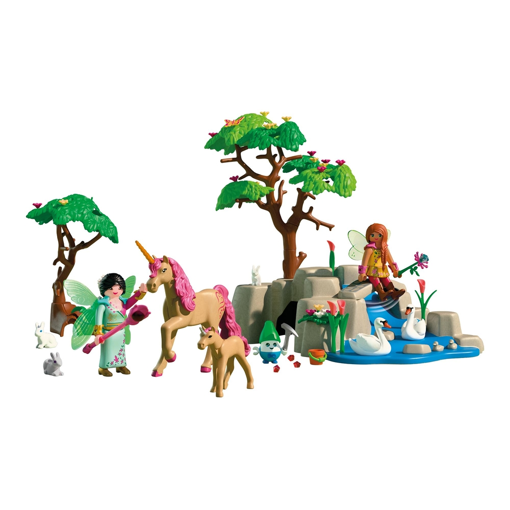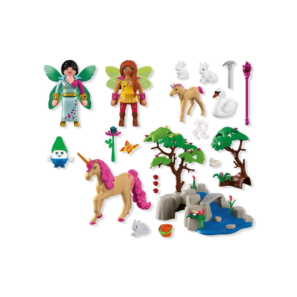 De set bevat 2 feeën, 1 vrolijk elfje, 1 eenhoorn met veulen, diverse bosdieren en een kleurrijk landschap met natuurlijke brug, boomstronken en bloemen voor een complete sprookjeservaring. Perfect voor fantasierijk en interactief speelplezier.