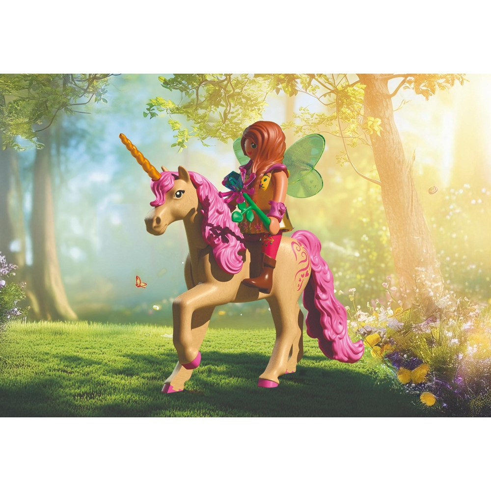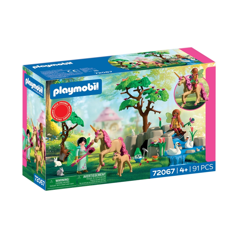 Met Playmobil 72067 Dagje Uit Met Feeën beleven kinderen een sprookjesachtig avontuur. Twee feeën, een vrolijk elfje en een eenhoorn met veulen trekken door een kleurrijk bos vol verborgen schatten en schattige dieren. Geschikt voor kinderen vanaf 4 jaar.