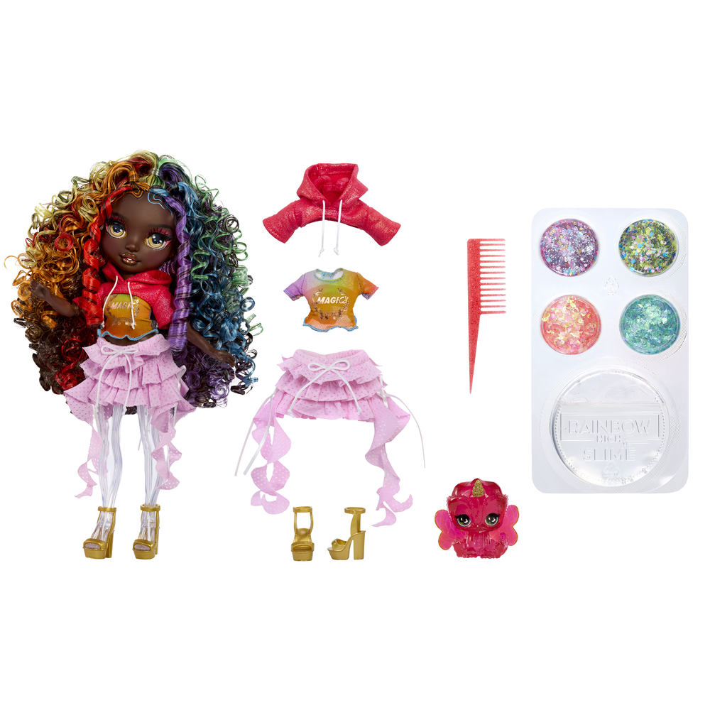 • Inhoud: modepop van 28 cm met aanpasbare benen, complete outfit, set met regenboogslijm (doorzichtig slijm en vier soorten glitters), magisch diertje en kam.
