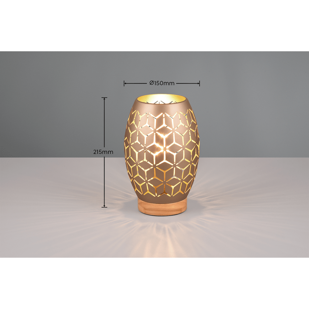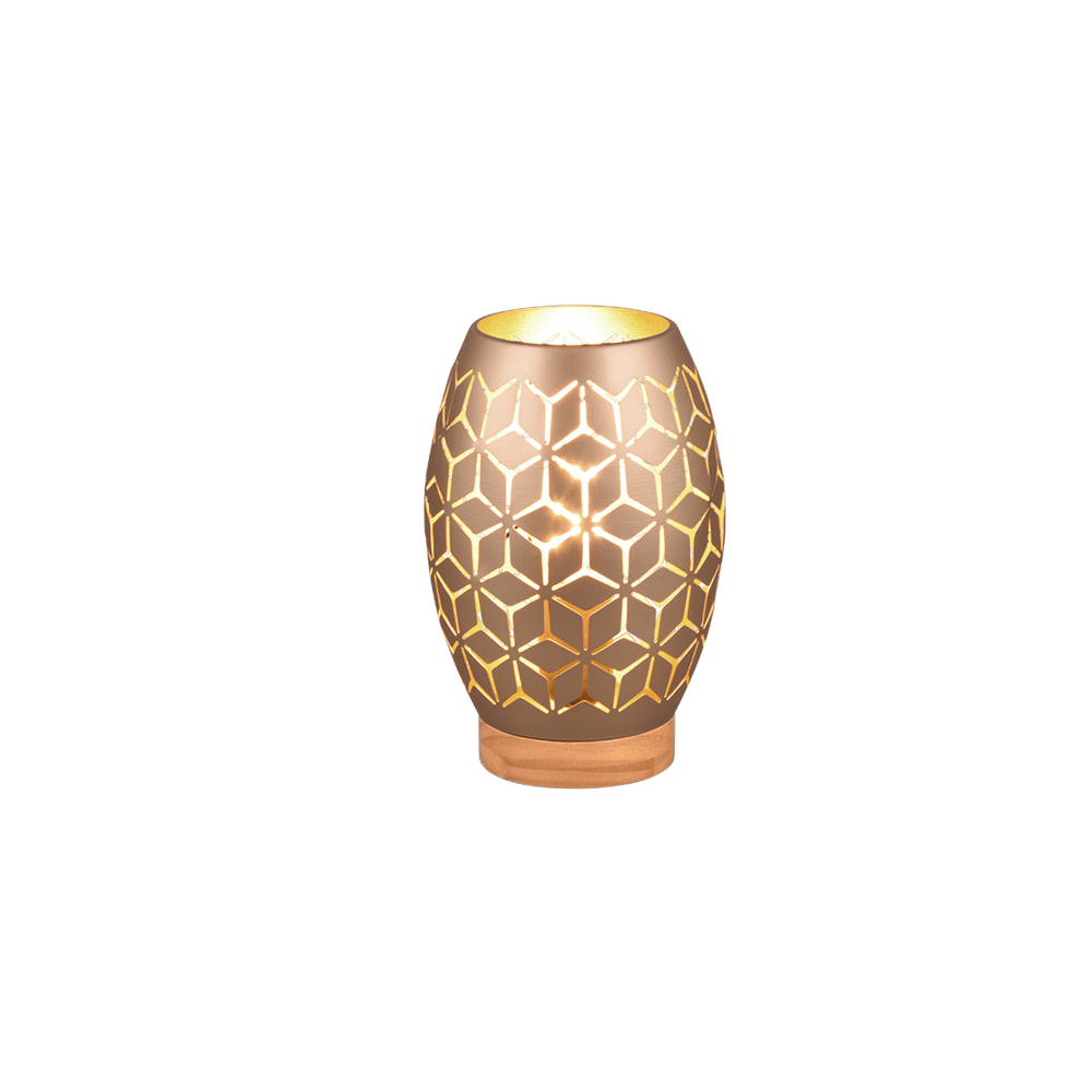 De Trio BIDAR tafellamp brengt een uniek lichtgevoel in je huis. Het zachte licht schijnt door het patroon van de lamp en creëert een betoverend lichtspel in de kamer. De natuurlijke houtaccenten versterken de gezellige en warme sfeer, terwijl de combinatie van koffie- en goudkleurig metaal een stijlvolle en moderne uitstraling geeft. Perfect als stralend middelpunt op je commode of bijzettafel. Werkt met E27 LED-lichtbronnen (excl. 28W) voor energiezuinig en duurzaam gebruik.