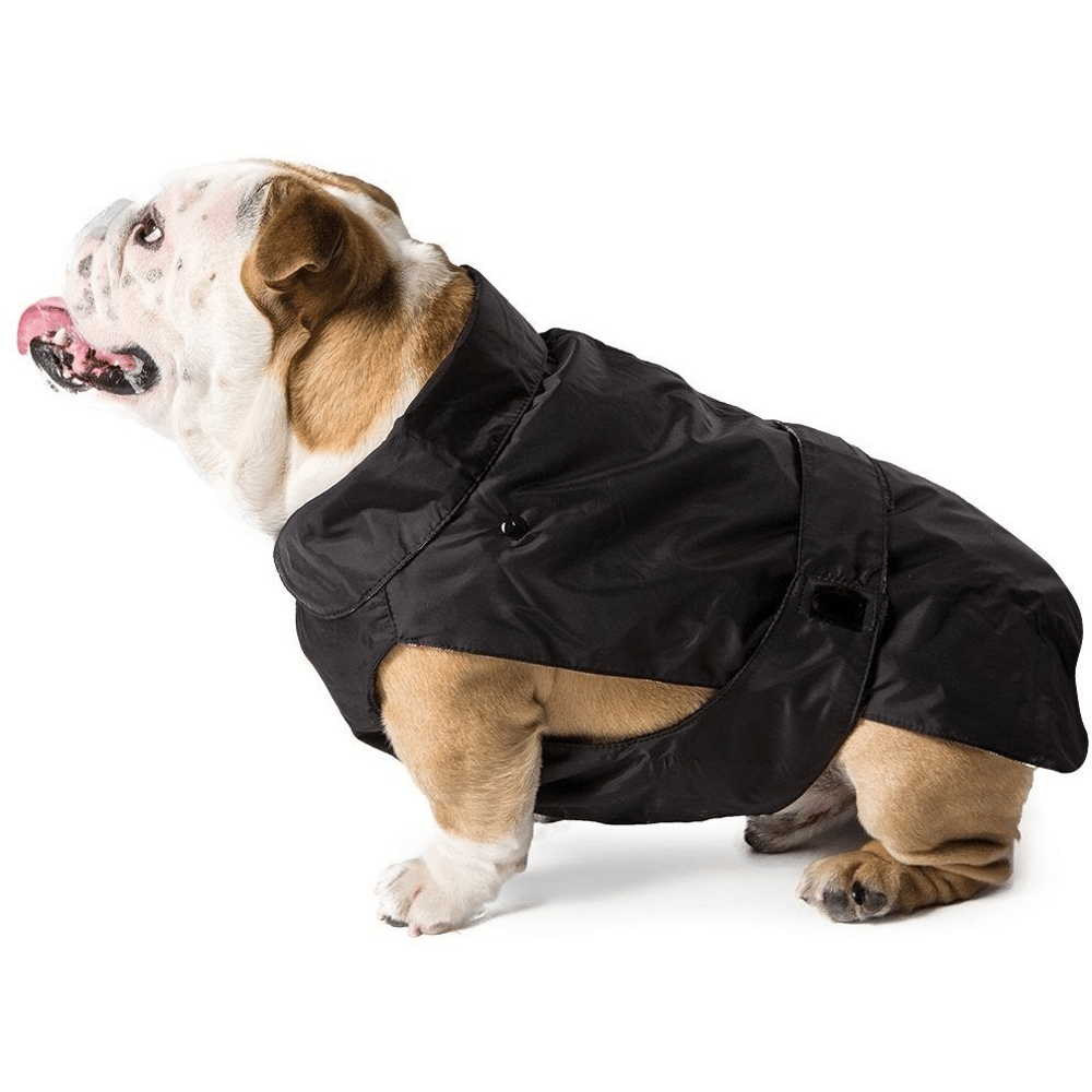 Houd je hond droog en comfortabel met deze zwarte Bulldog hondenregenjas. Voorzien van een uitneembare voering en waterdichte buitenlaag, ideaal voor middelgrote tot grote honden.