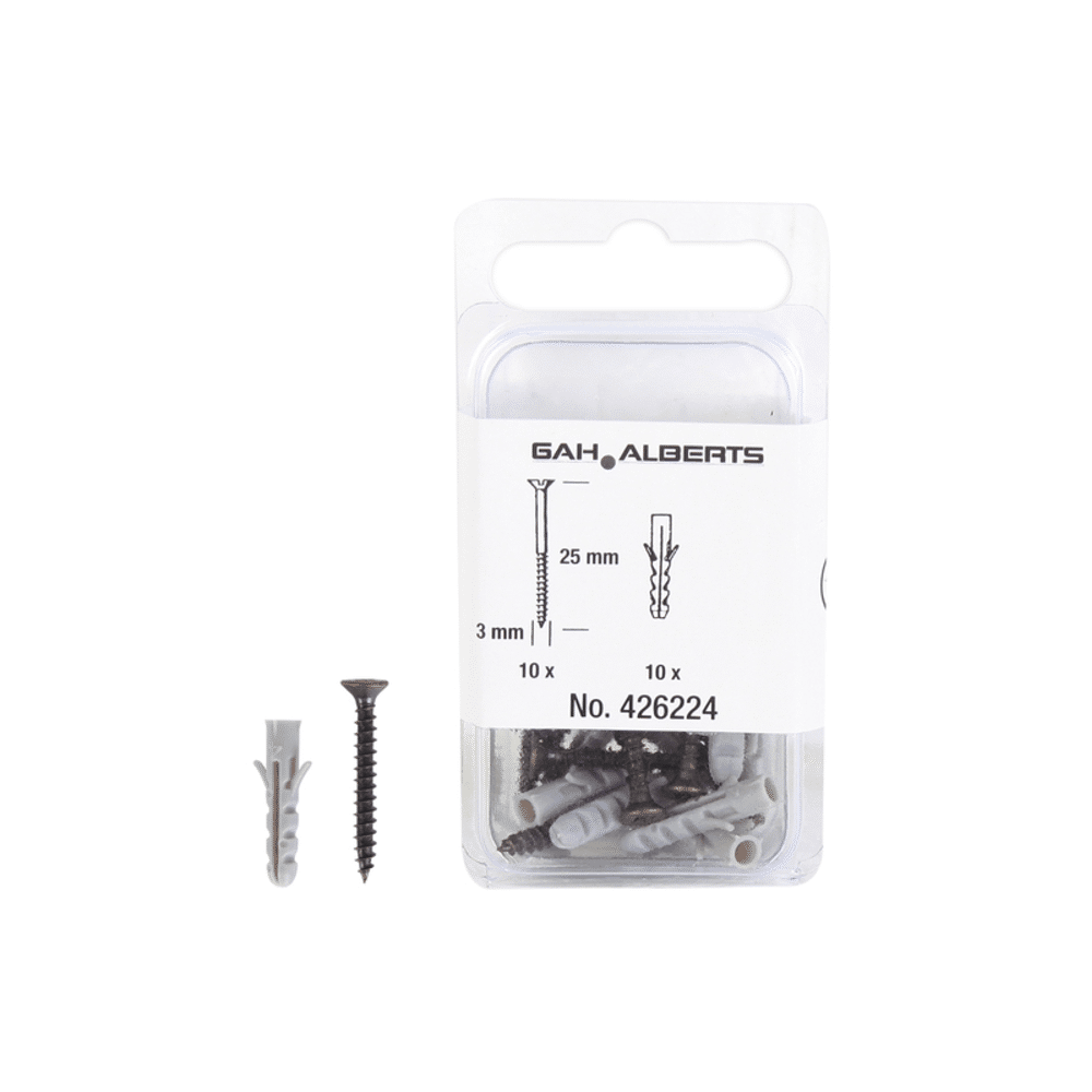 De Schroeven-/pluggenset ø3x25 mm bevat 10 stuks en is ideaal voor betrouwbare en duurzame bevestigingen in diverse materialen.