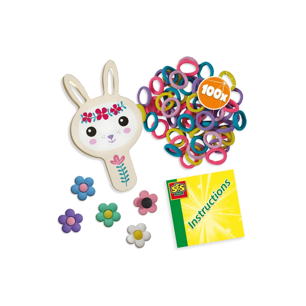 Dankzij het schattige houten punnikpopje in konijnvorm maak je zonder moeite de mooiste creaties. De zachte elastiekjes zijn speciaal ontworpen voor kleine handjes en zorgen voor een comfortabel eindresultaat.